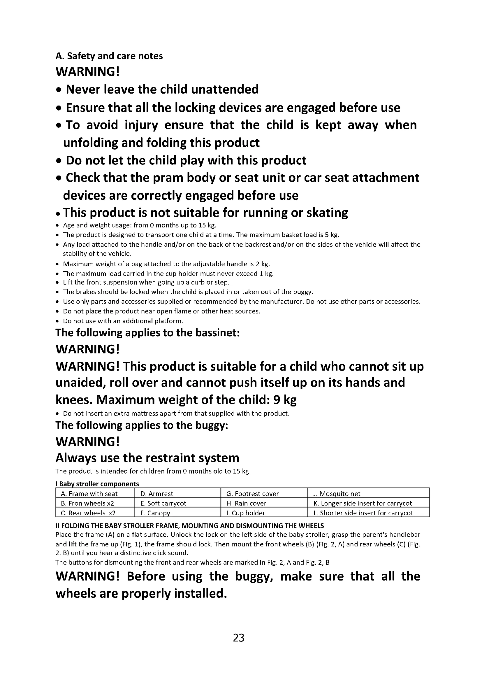 - Do not insert an extra mattress apart from that supplied with the product. The following applies to the buggy: WARNING! Always use the restraint system The product is intended for children from 0 months old to 15 kg I Baby stroller components A. Frame with seat D. Armrest G. Footrest cover J. Mosquito net B. Fron wheels x2 E. Soft carrycot H. Rain cover K. Longer side insert for carrycot C. Rear wheels x2 F. Canopy