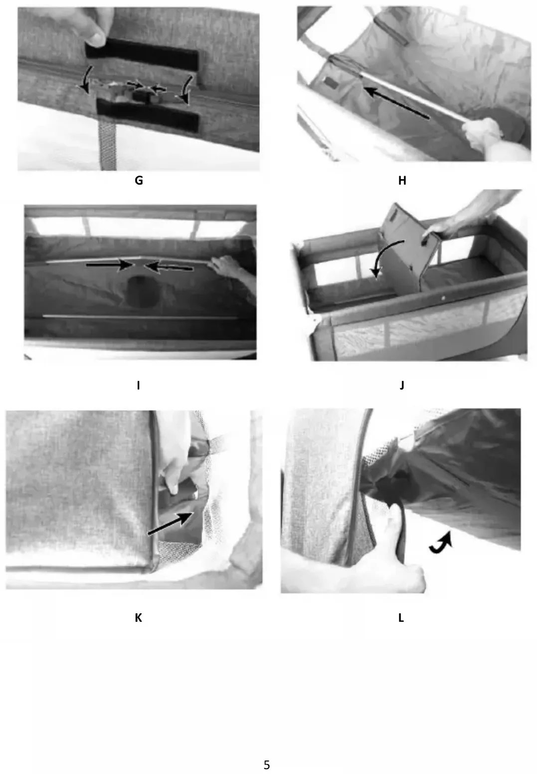 Unzip the bag and take the bed out of the bag. Separate velcro fasteners on the folding surface (2). Take out the bed and other elements of the set. In order to unfold the frame (1), place it appropriately - wheels down (Figure A), move the corners apart in order to grasp middle elements of sides, and then pull shorter sides up (sharply) to lock them (Figure B). Grasp middle elements of longer sides and pull them (firmly) until they lock (Figure C). Then press down on the center part of the bed’s bottom – facing it down (Figure D). The frame will fully unload and the bed will be locked (Figure E). NOTE: Make sure that all four center elements of the bed’s sides are locked! The side locking mechanisms will not work when the bottom part of the bed will be laid flat. Therefore, when locking the sides, the central part of the bottom must be raised. When the suspended floor (3) is not installed, install it with the zip fastener (Figure F) and secure with the clamp (Figure G). Place support tubes (4) into holes in the suspended floor (Figures H and I), and then place the base (2) inside the bed (Figure J). NOTE: For safety purposes, attach straps under the base – starting from the opening of the entrance (open the entrance in order to fasten the straps32 under the floor (Figures K and L)) and ending on the opposite side. To facilitate the installation of the opposite side, it is recommended to partially unclip the zipper around the suspended floor (Figure M), and then insert the straps into holes and attach to velcro straps under the floor (Figures N and O). Fasten the zipper around the floor and lock it by clipping it into the buckle (Figure P).