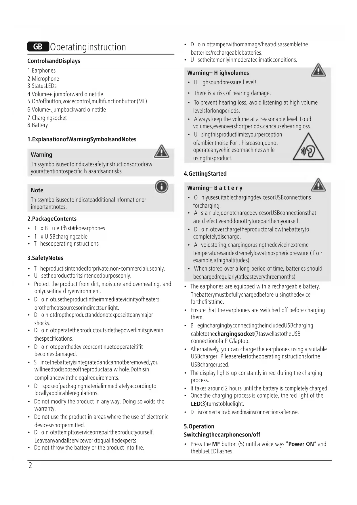 - The earphones areequipped with arechargeablebattery. The battery must be fully charged beforeusing the device for the rst time.