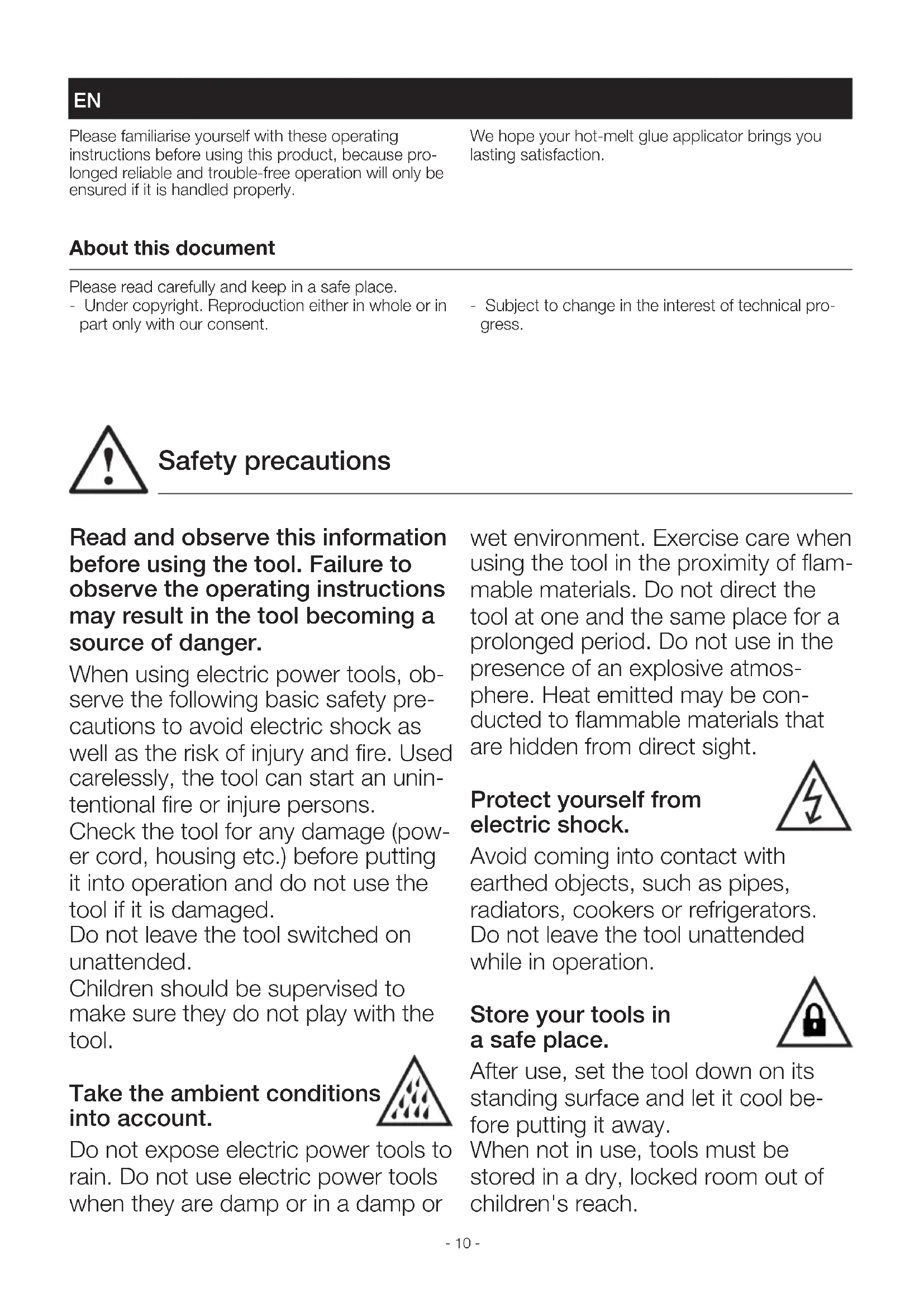 HERSTELLER GARANTIE HERSTELLER GARANTIE DE- 10 - Please familiarise yourself with these operating instructions before using this product, because pro- longed reliable and trouble-free operation will only be ensured if it is handled properly. We hope your hot-melt glue applicator brings you lasting satisfaction. GBTranslation of the original operating instructions About this document Please read carefully and keep in a safe place. - Under copyright. Reproduction either in whole or in part only with our consent. - Subject to change in the interest of technical pro- gress. Read and observe this information before using the tool. Failure to observe the operating instructions may result in the tool becoming a source of danger. When using electric power tools, ob- serve the following basic safety pre- cautions to avoid electric shock as well as the risk of injury and fire. Used carelessly, the tool can start an unin- tentional fire or injure persons. Check the tool for any damage (pow- er cord, housing etc.) before putting it into operation and do not use the tool if it is damaged. Do not leave the tool switched on unattended. Children should be supervised to make sure they do not play with the tool. Take the ambient conditions into account. Do not expose electric power tools to rain. Do not use electric power tools when they are damp or in a damp or wet environment. Exercise care when using the tool in the proximity of flam- mable materials. Do not direct the tool at one and the same place for a prolonged period. Do not use in the presence of an explosive atmos- phere. Heat emitted may be con- ducted to flammable materials that are hidden from direct sight. Protect yourself from electric shock. Avoid coming into contact with earthed objects, such as pipes, radiators, cookers or refrigerators. Do not leave the tool unattended while in operation. Store your tools in a safe place. After use, set the tool down on its standing surface and let it cool be- fore putting it away. When not in use, tools must be stored in a dry, locked room out of children's reach. Safety precautions EN- 10 - - 11 - This tool may be used by children aged 8 or above and by persons with reduced physical, sensory or mental capabilities or lack of experience and knowledge if they are supervised or have been given instructions on how to use the tool safely and understand the hazards involved. Do not allow children to play with the tool. Children are not allowed to clean or carry out maintenance work on the tool without supervision. Do not overload your tools. Your work results and safety will be enhanced if you operate the tool within the specified output range. Do not carry the tool by the power cord. Do not unplug the tool by pulling on the power cord. Protect the power cord from heat, oil and sharp edges. Beware of toxic gases and fire hazards. Toxic gases may develop when working on plastics, paints, varnishes or similar materials. Beware of fire and ignition hazards. For your own safety, only use acces- sories and attachments that are specified in the operating instructions or recommended or specified by the tool manufacturer. Using attachments or accessories other than those recommended in the operating instructions or cata- logue may result in personal injury. Repairs by a qualified electrician only. This electric power tool com- plies with the relevant safety regula- tions. Repairs should only be per- formed by a qualified electrician. Oth- erwise the user may run the risk of accidents. If this tool's main power cord is dam- aged, it must be replaced by the manufacturer or its customer service department or a similarly qualified person so as to avoid hazards. Keep these safety precautions with the tool. Safety precautions GB- 12 -