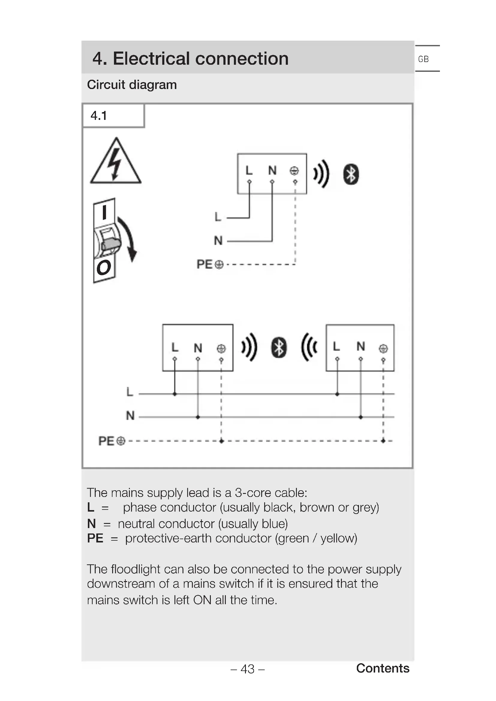 The mains supply lead is a 3-core cable: L = phase conductor (usually black, brown or grey) N = neutral conductor (usually blue) PE = protective-earth conductor (green/yellow) The floodlight can also be connected to the power supply downstream of a mains switch if it is ensured that the mains switch is left ON all the time.– 44 – Contents The light source of this light cannot be replaced. If the light source needs to be replaced (e.g. at the end of its service life), the complete light must be replaced.