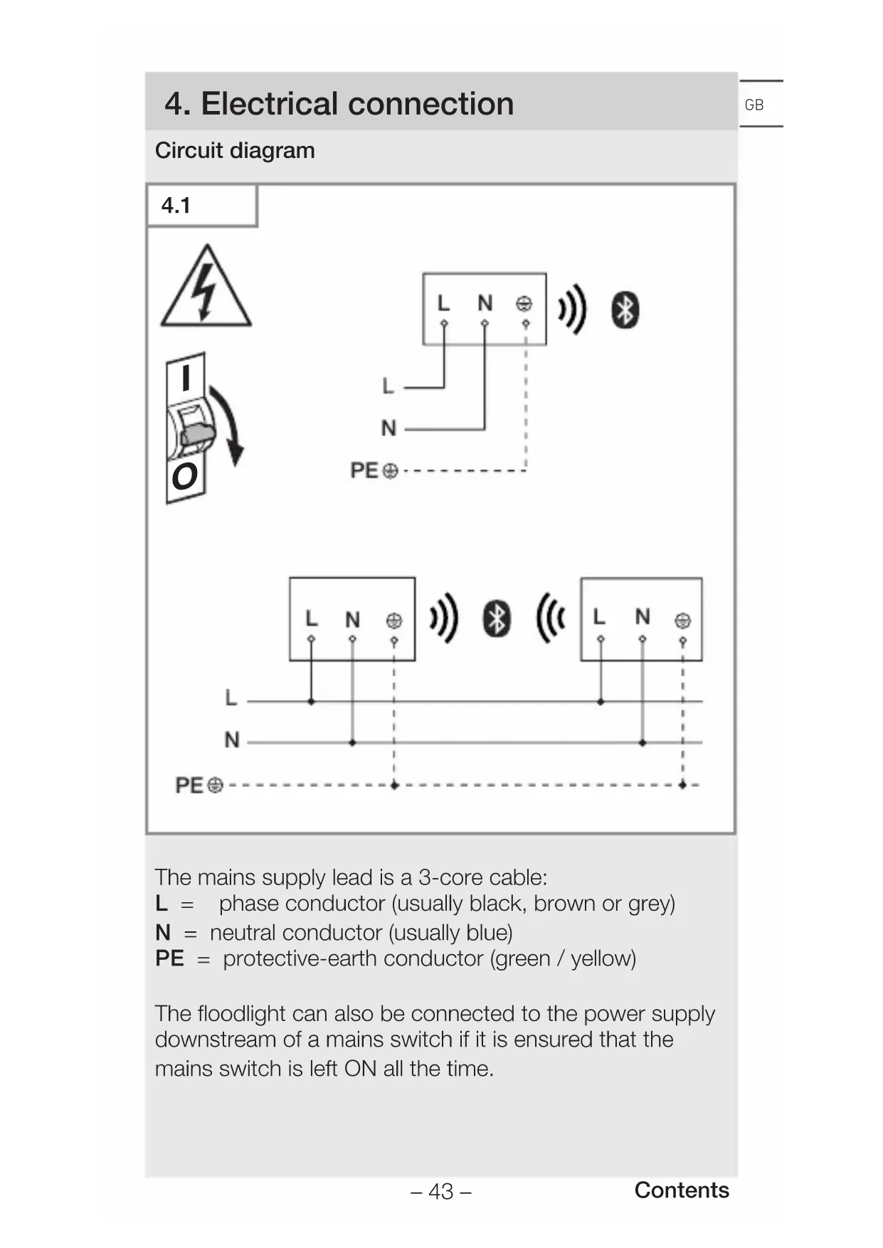 The mains supply lead is a 3-core cable: L = phase conductor (usually black, brown or grey) N = neutral conductor (usually blue) PE = protective-earth conductor (green/yellow) The floodlight can also be connected to the power supply downstream of a mains switch if it is ensured that the mains switch is left ON all the time.– 44 – Contents The light source of this light cannot be replaced. If the light source needs to be replaced (e.g. at the end of its service life), the complete light must be replaced.