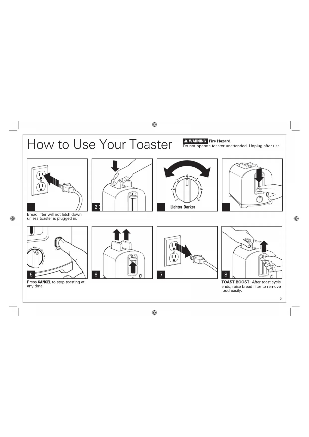 TOAST BOOST: After toast cycle ends, raise bread lifter to remove food easily. w WARNING Fire Hazard. Do not operate toaster unattended. Unplug after use.6