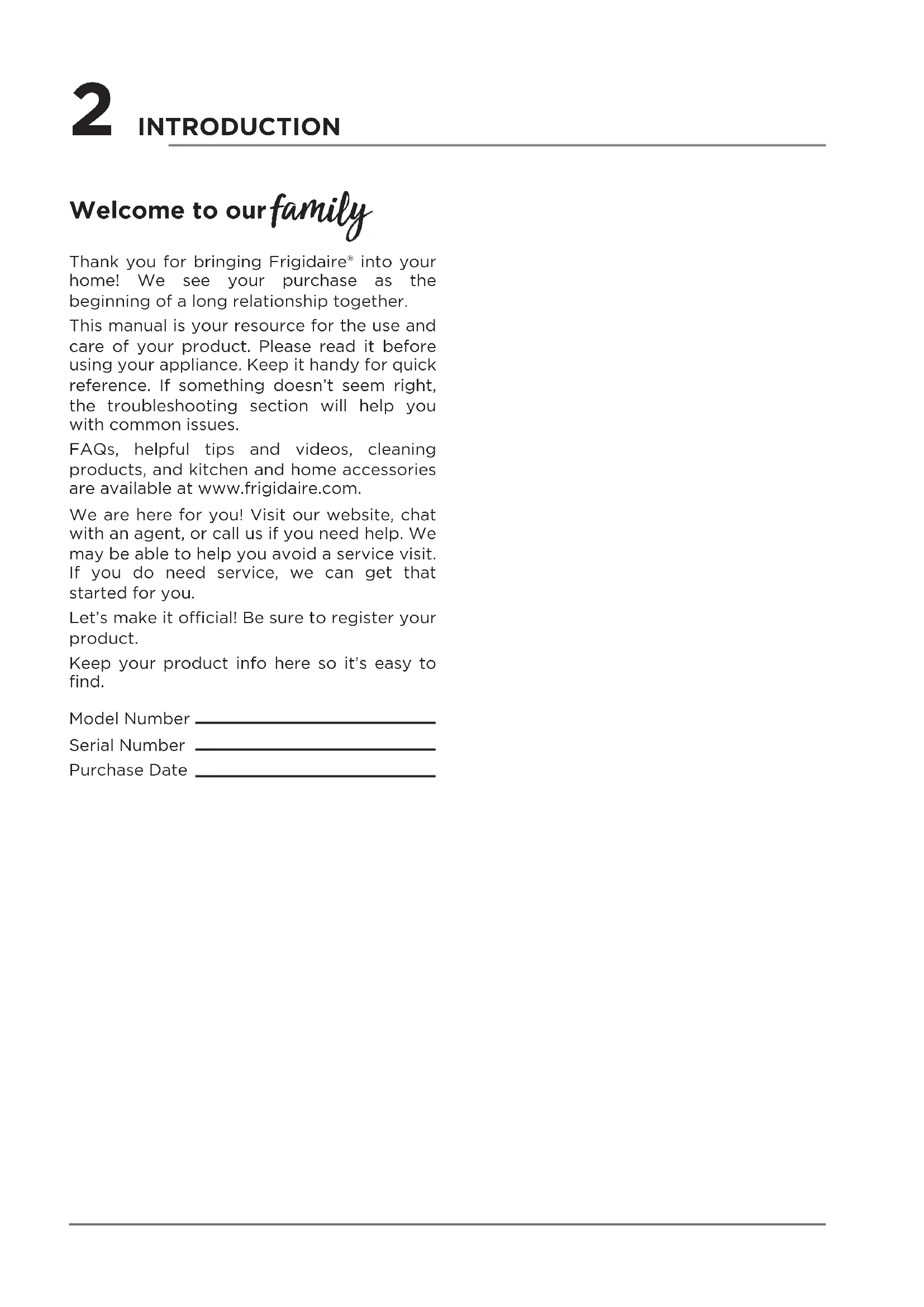 Please refer to your product’s nameplate to check service model number.2 INTRODUCTION Welcome to our family Model Number Serial Number Purchase Date Thank you for bringing Frigidaire® into your home! We see your purchase as the beginning of a long relationship together. This manual is your resource for the use and care of your product. Please read it before using your appliance. Keep it handy for quick reference. If something doesn’t seem right, the troubleshooting section will help you with common issues. FAQs, helpful tips and videos, cleaning products, and kitchen and home accessories are available at www.frigidaire.com. We are here for you! Visit our website, chat with an agent, or call us if you need help. We may be able to help you avoid a service visit. If you do need service, we can get that started for you. Let’s make it ocial! Be sure to register your product. Keep your product info here so it’s easy to find.3 For Your Safety