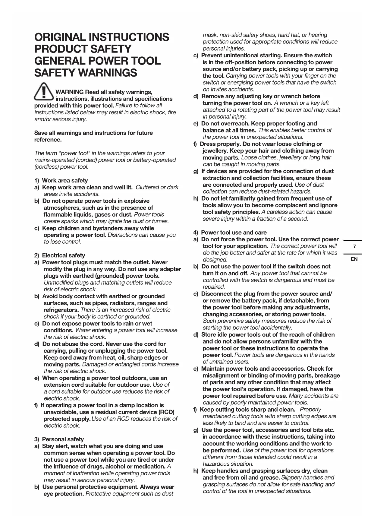 SAFETY WARNINGS WARNING Read all safety warnings, instructions, illustrations and specifications provided with this power tool. Failure to follow all instructions listed below may result in electric shock, re and/or serious injury. Save all warnings and instructions for future reference. The term "power tool" in the warnings refers to your mains-operated (corded) power tool or battery-operated (cordless) power tool.