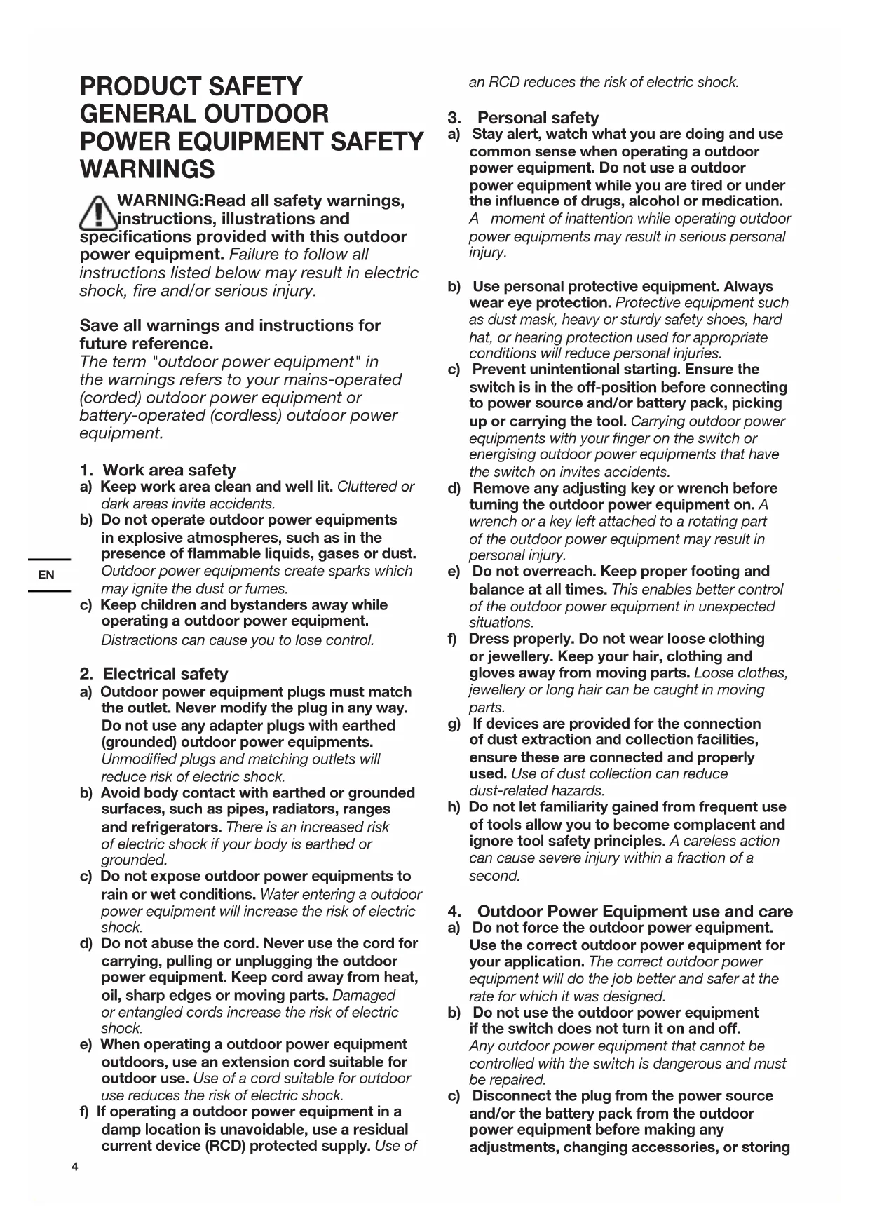 instructions, illustrations and specifications provided with this outdoor power equipment. Failure to follow all instructions listed below may result in electric shock, fire and/or serious injury. Save all warnings and instructions for future reference. The term "outdoor power equipment" in the warnings refers to your mains-operated (corded) outdoor power equipment or battery-operated (cordless) outdoor power equipment.