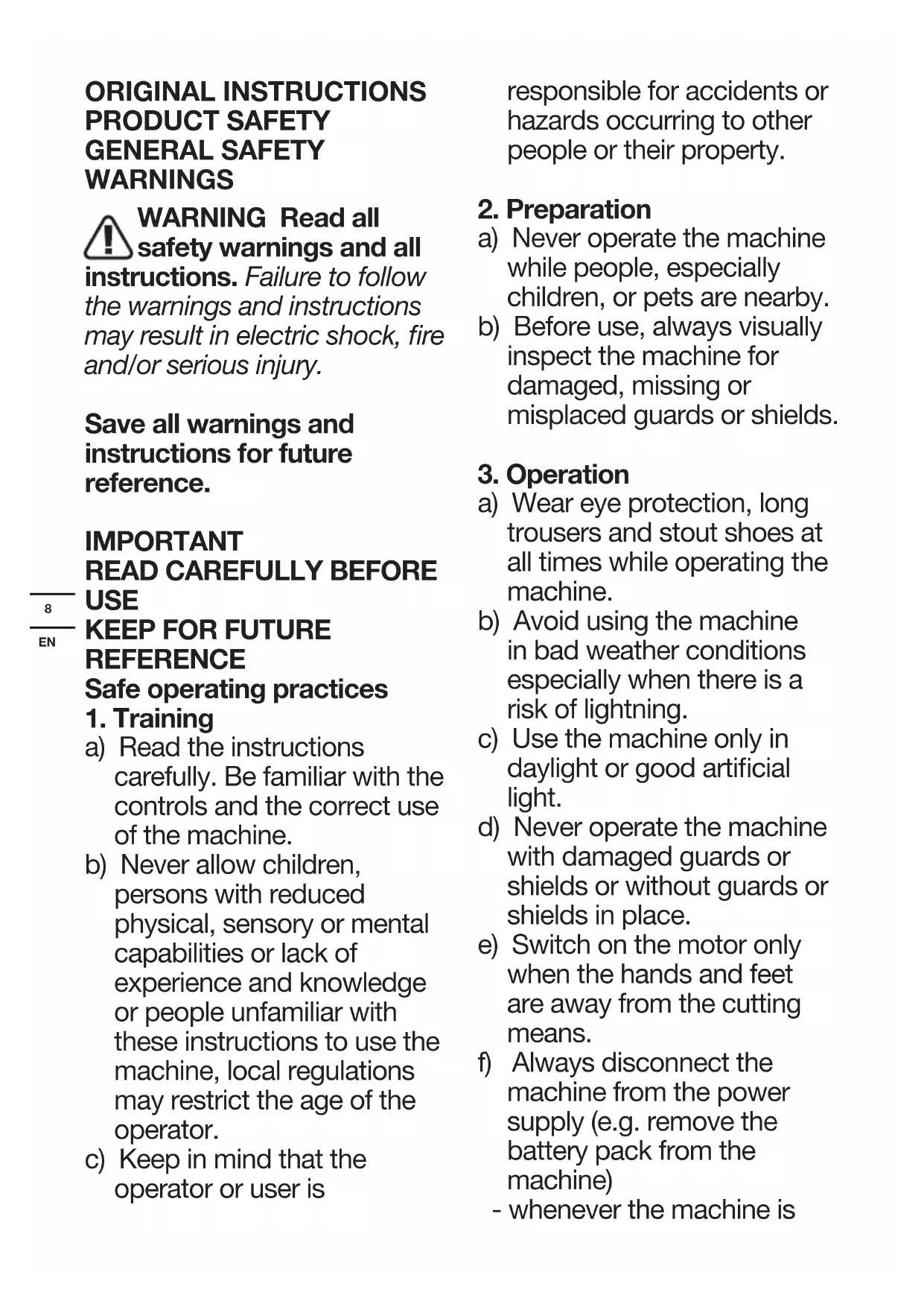 a) Wear eye protection, long trousers and stout shoes at all times while operating the machine. b) Avoid using the machine in bad weather conditions especially when there is a risk of lightning. c) Use the machine only in daylight or good articial light. d) Never operate the machine with damaged guards or shields or without guards or shields in place. e) Switch on the motor only when the hands and feet are away from the cutting means. f) Always disconnect the machine from the power supply (e.g. remove the battery pack from the machine) - whenever the machine is9