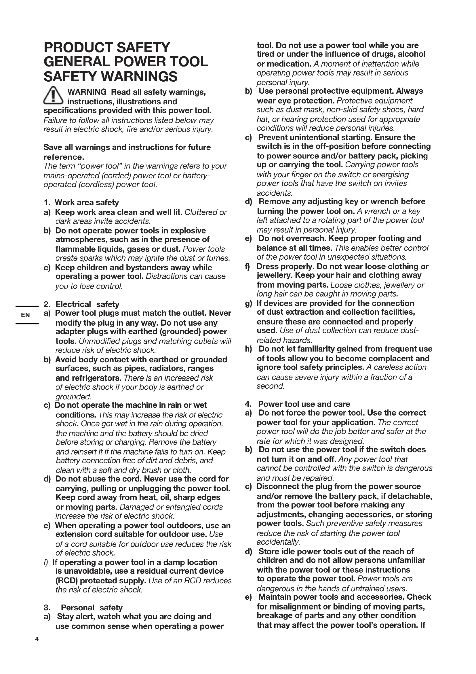 a) Stay alert, watch what you are doing and use common sense when operating a power tool. Do not use a power tool while you are tired or under the influence of drugs, alcohol or medication. A moment of inattention while operating power tools may result in serious personal injury. b) Use personal protective equipment. Always wear eye protection. Protective equipment such as dust mask, non-skid safety shoes, hard hat, or hearing protection used for appropriate conditions will reduce personal injuries. c) Prevent unintentional starting. Ensure the switch is in the off-position before connecting to power source and/or battery pack, picking up or carrying the tool. Carrying power tools with your finger on the switch or energising power tools that have the switch on invites accidents. d) Remove any adjusting key or wrench before turning the power tool on. A wrench or a key left attached to a rotating part of the power tool may result in personal injury. e) Do not overreach. Keep proper footing and balance at all times. This enables better control of the power tool in unexpected situations. f) Dress properly. Do not wear loose clothing or jewellery. Keep your hair and clothing away from moving parts. Loose clothes, jewellery or long hair can be caught in moving parts. g) If devices are provided for the connection of dust extraction and collection facilities, ensure these are connected and properly used. Use of dust collection can reduce dust- related hazards. h) Do not let familiarity gained from frequent use of tools allow you to become complacent and ignore tool safety principles. A careless action can cause severe injury within a fraction of a second.