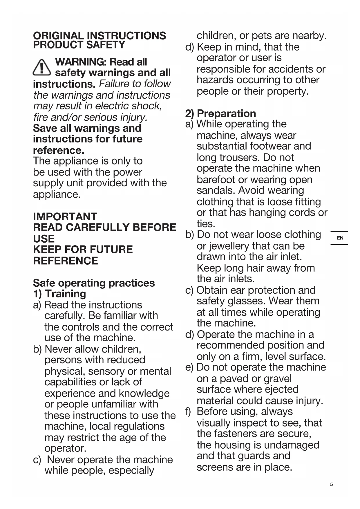 a) While operating the machine, always wear substantial footwear and long trousers. Do not operate the machine when barefoot or wearing open sandals. Avoid wearing clothing that is loose tting or that has hanging cords or ties. b) Do not wear loose clothing or jewellery that can be drawn into the air inlet. Keep long hair away from the air inlets. c) Obtain ear protection and safety glasses. Wear them at all times while operating the machine. d) Operate the machine in a recommended position and only on a rm, level surface. e) Do not operate the machine on a paved or gravel surface where ejected material could cause injury. f) Before using, always visually inspect to see, that the fasteners are secure, the housing is undamaged and that guards and screens are in place.6