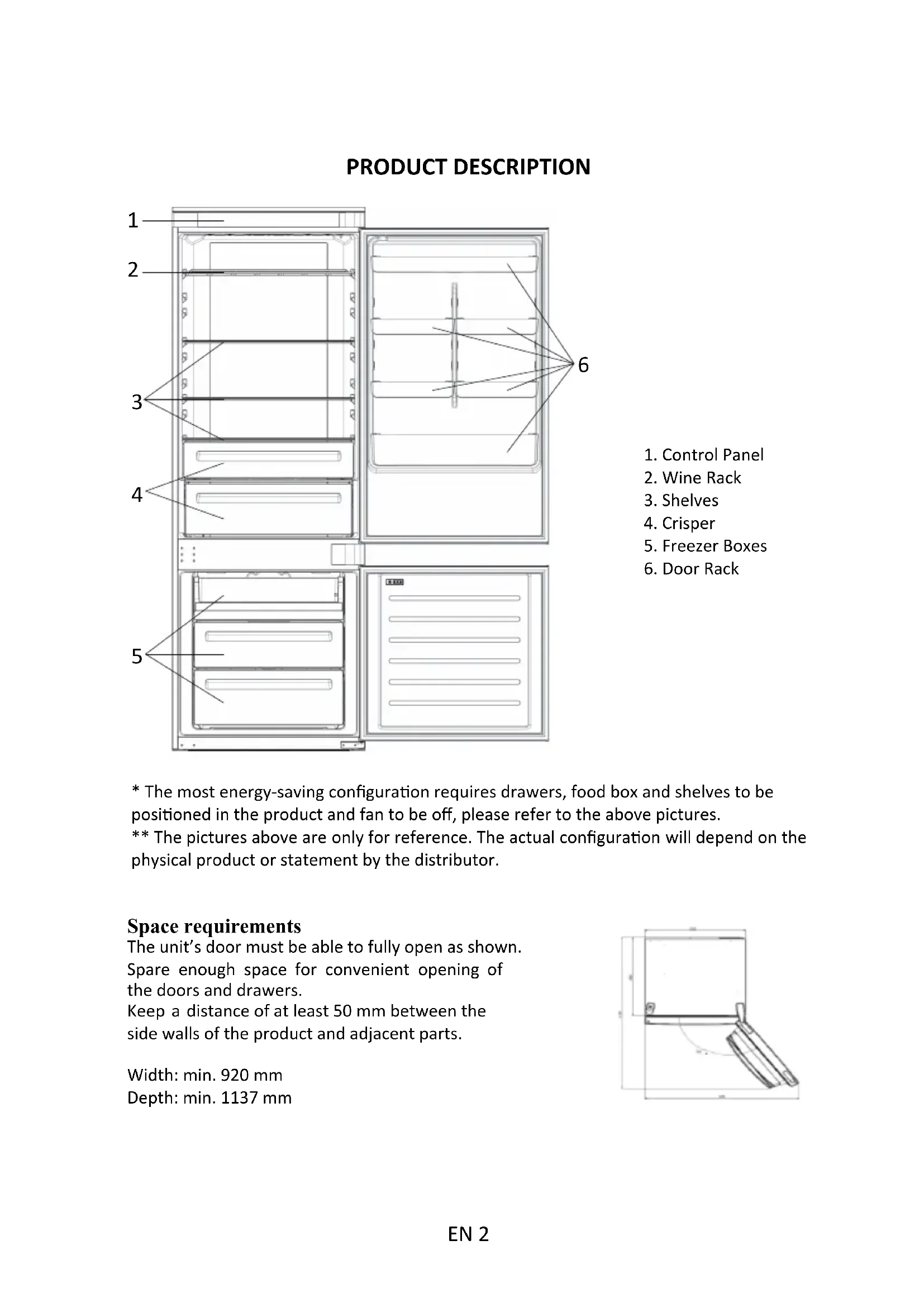 - The most energy-saving configuraon requires drawers, food box and shelves to be posioned in the product and fan to be off, please refer to the above pictures. ** The pictures above are only for reference. The actual configuraon will depend on the physical product or statement by the distributor. Space requirements The unit’s door must be able to fully open as shown. Spare enough space for convenient opening of the doors and drawers. Keep a distance of at least 50 mm between the side walls of the product and adjacent parts. Width: min. 920 mm Depth: min. 1137 mm