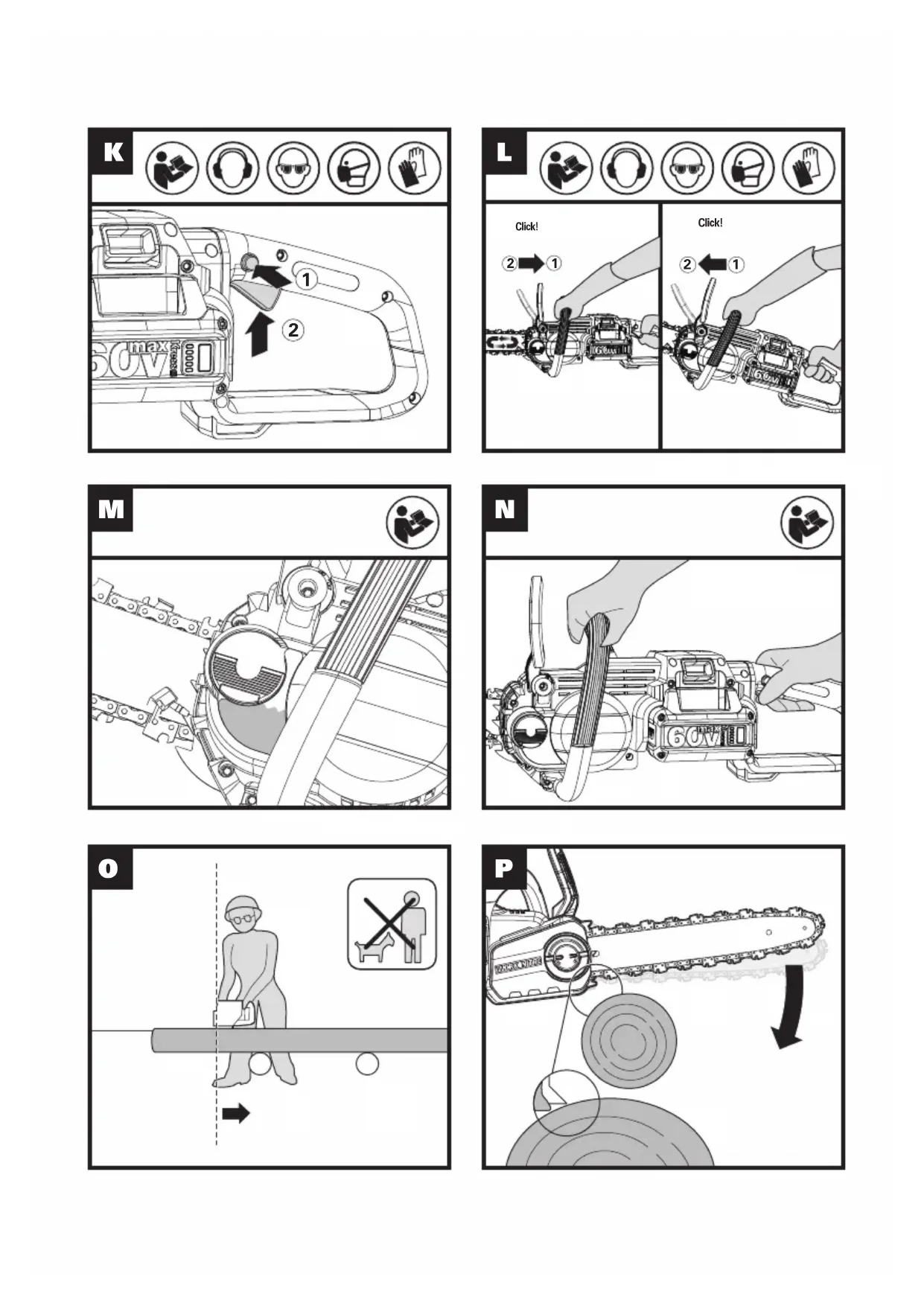 22/311/3122/31/3 Fig.1 Fig.2 Fig.3 Fig.4 Fig.5 Fig.6 SYMBOLS To reduce the risk of injury, user must read instruction manual WARNING Wear ear protection Wear eye protection Wear dust mask Always use chain saw two-handed Beware of chain saw kickback and avoid contact with bar tip Do not expose to rain Wear head protection Wear protective gloves Waste electrical products must not be disposed of with household waste. Please recycle where facilities exist. Check with your local authorities or retailer for recycling advice. Li-Ion battery This product has been marked with a symbol relating to ‘separate collection’ for all battery packs and battery pack. It will then be recycled or dismantled in order to reduce the impact on the environment. Battery packs can be hazardous for the environment and for human health since they contain hazardous substances. Do not burn Batteries may enter water cycle if disposed improperly, which can be hazardous for ecosystem. Do not dispose of waste batteries as unsorted municipal waste. Unlock Lock12