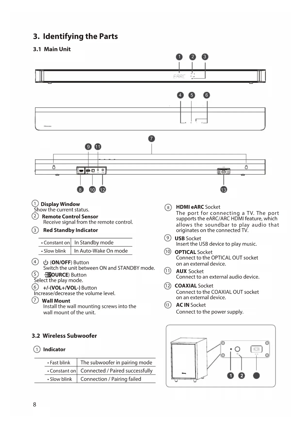 For US For EU For UK For AUS back or the underside of the unit.5.8 Pair up with the Subwoofer Automatic pairing The subwoofer and soundbar will automatically pair when they are plugged into the mains sockets and turned on. No cable is needed for connecting the two units.