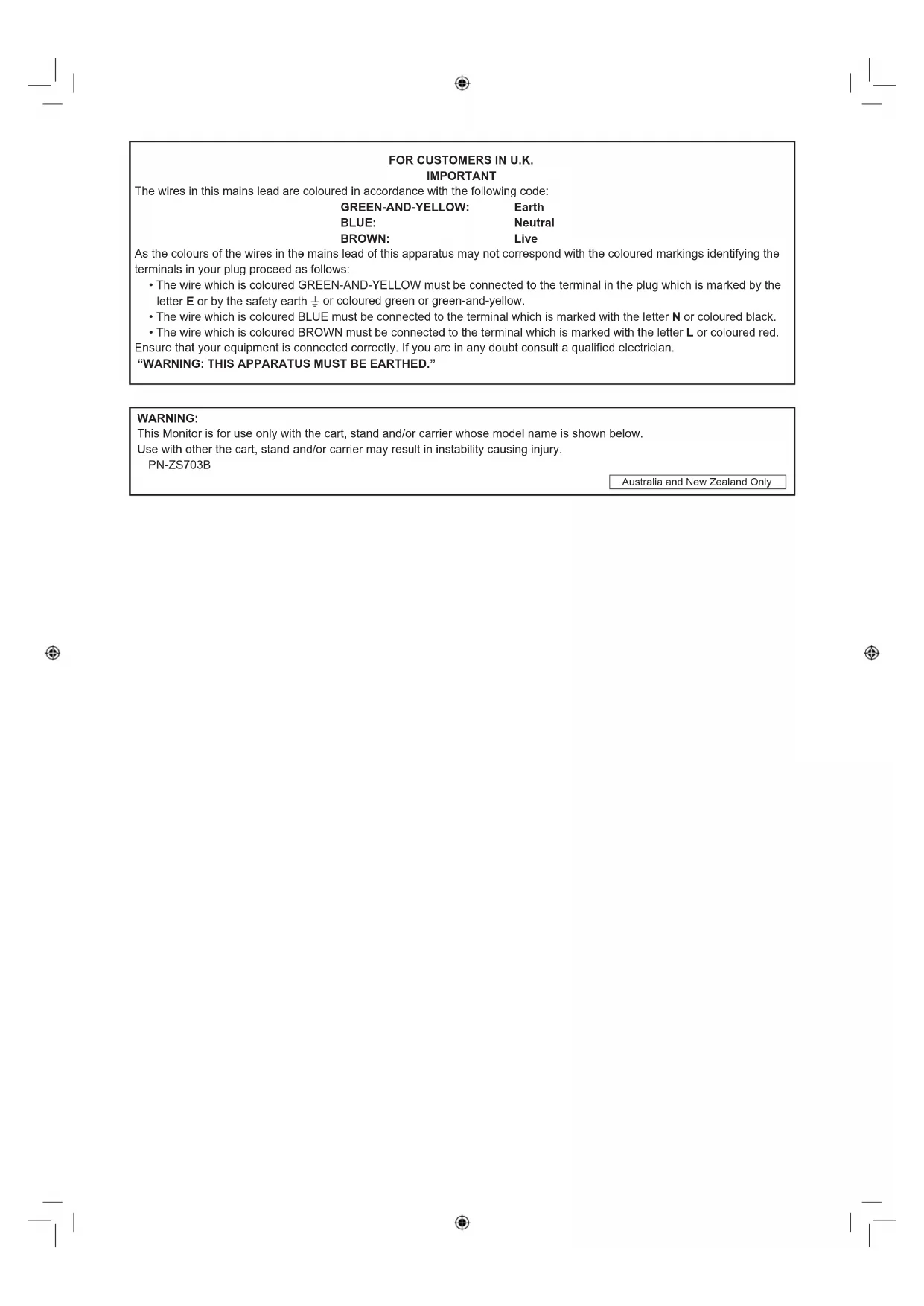 This Monitor is for use only with the cart, stand and/or carrier whose model name is shown below. Use with other the cart, stand and/or carrier may result in instability causing injury. PN-ZS703B Australia and New Zealand OnlyENGLISH