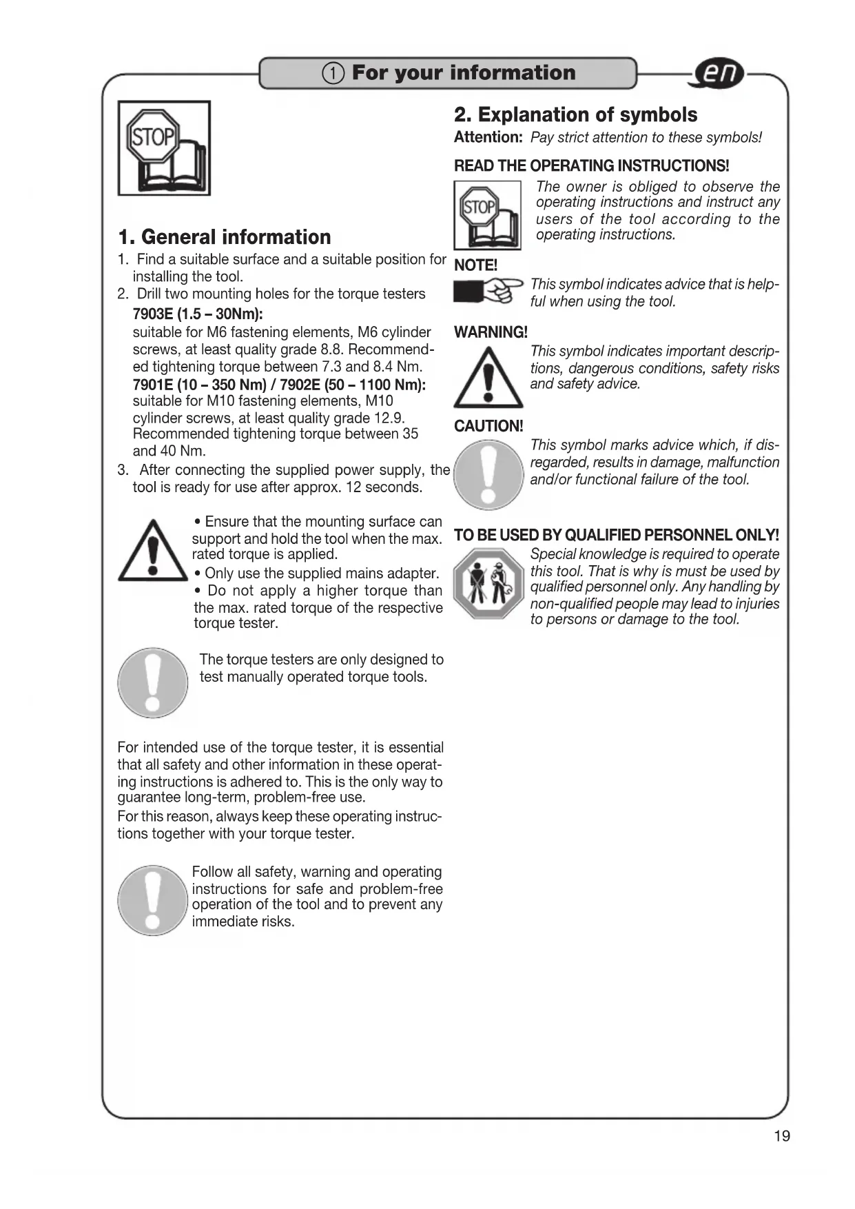 tions together with your torque tester. Follow all safety, warning and operating instructions for safe and problem-free operation of the tool and to prevent any immediate risks.