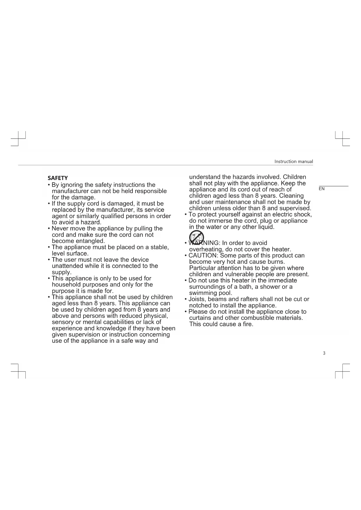 - Please do not install the appliance close to curtains and other combustible materials. This could cause a fire. ENInstruction manual