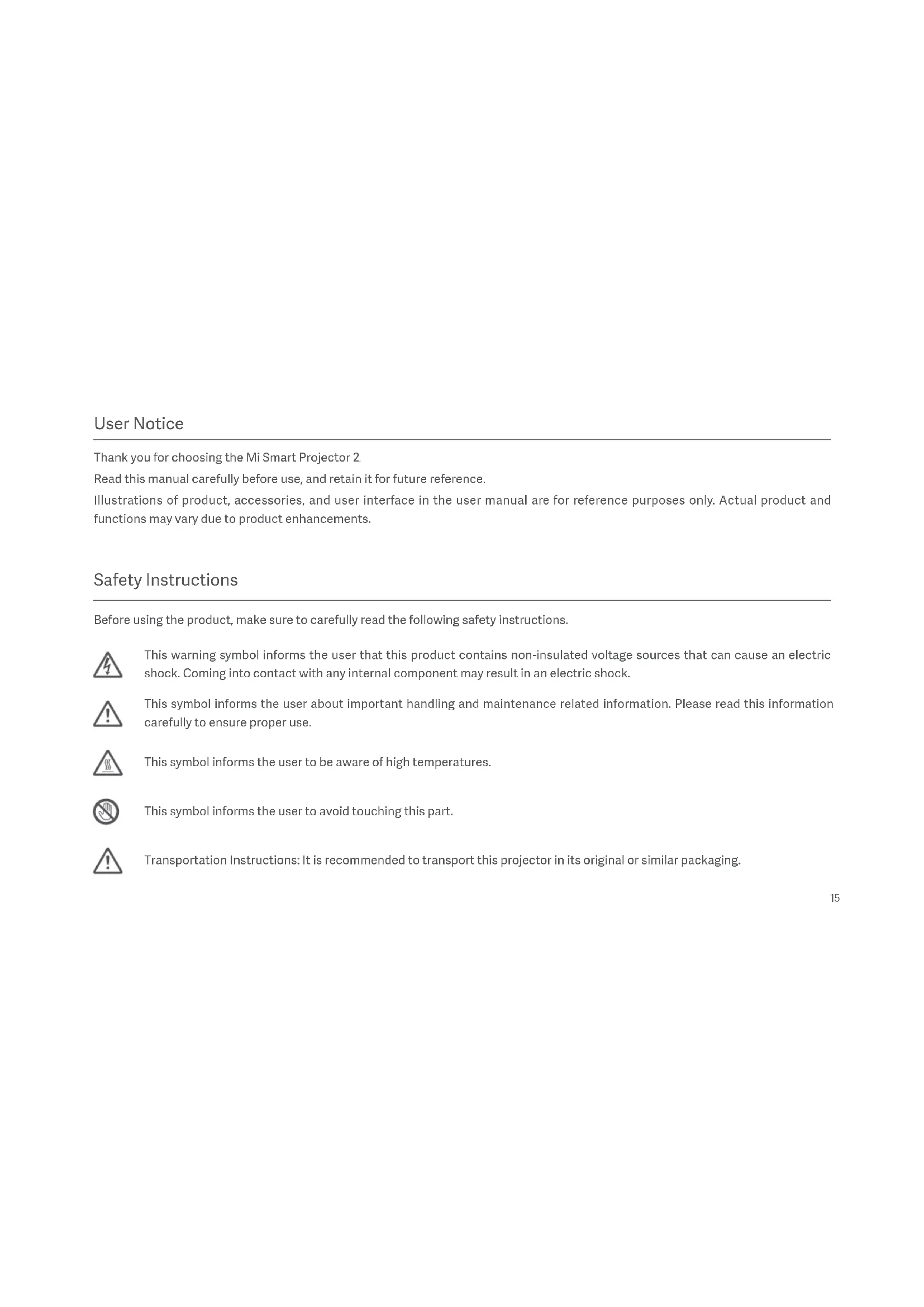 Read this manual carefully before use, and retain it for future reference. Illustrations of product, accessories, and user interface in the user manual are for reference purposes only. Actual product and functions may vary due to product enhancements. Safety Instructions Before using the product, make sure to carefully read the following safety instructions. This warning symbol informs the user that this product contains non-insulated voltage sources that can cause an electric shock. Coming into contact with any internal component may result in an electric shock. This symbol informs the user about important handling and maintenance related information. Please read this information carefully to ensure proper use. This symbol informs the user to be aware of high temperatures. This symbol informs the user to avoid touching this part. Transportation Instructions: It is recommended to transport this projector in its original or similar packaging.16 Preventing Electric Shocks and Fire Hazards: Safety Precautions: - Only use the provided genuine power adapter. - Unplug the projector from the electrical outlet during thunderstorms or when it is not being used for a long time, so as to avoid damage caused by a power surge or lightning strike. - Do not place any flammable objects near this projector so as to avoid fire. - Do not block any of the vents as this may cause heat build-up inside the projector, and possibly result in a fire. - Do not block the lens when the projector is turned on. Any object placed close to the lens may get very hot and/or deformed, and may even cause a fire.
