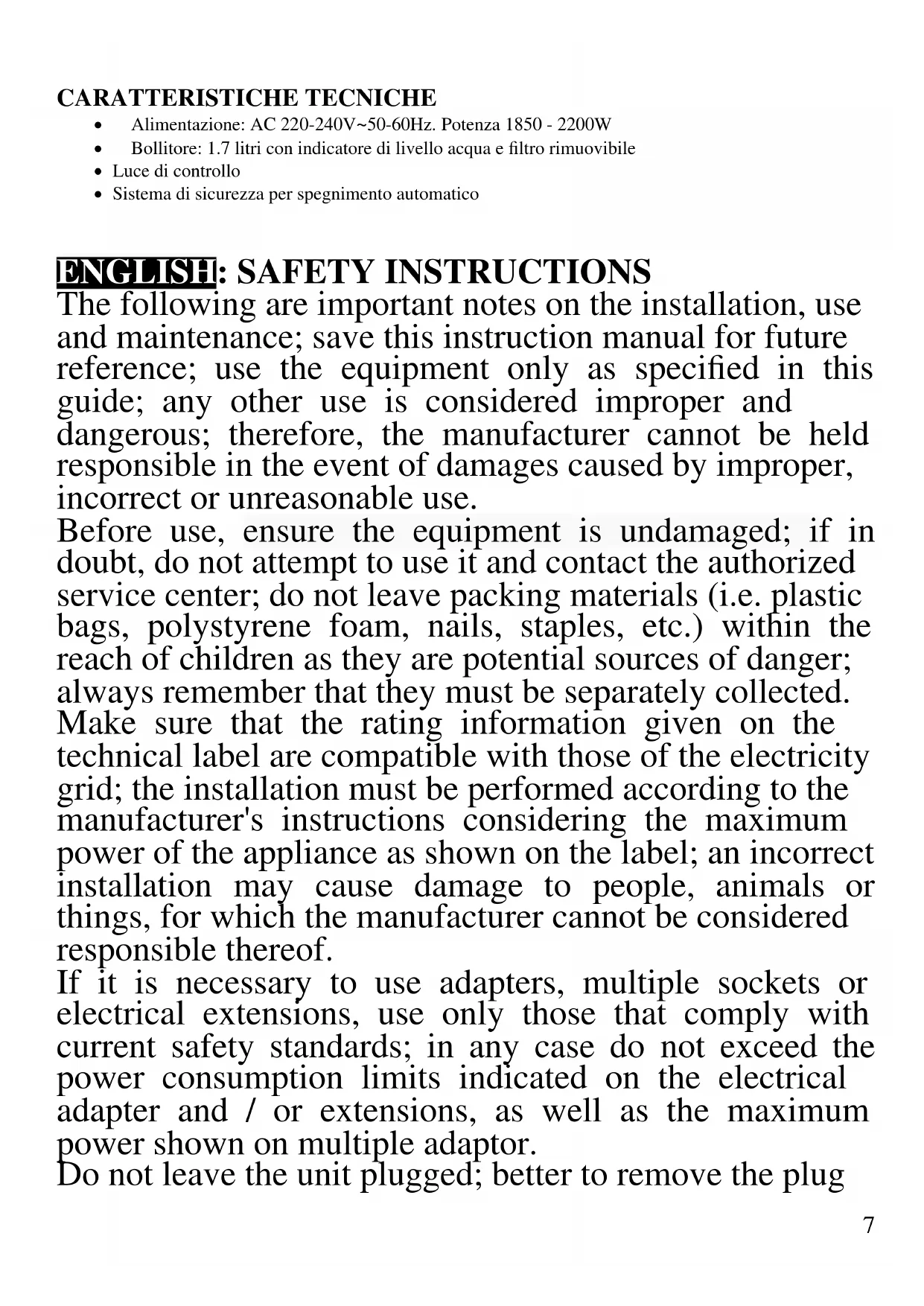 The following are important notes on the installation, use and maintenance; save this instruction manual for future reference; use the equipment only as specified in this guide; any other use is considered improper and dangerous; therefore, the manufacturer cannot be held responsible in the event of damages caused by improper, incorrect or unreasonable use. Before use, ensure the equipment is undamaged; if in doubt, do not attempt to use it and contact the authorized service center; do not leave packing materials (i.e. plastic bags, polystyrene foam, nails, staples, etc.) within the reach of children as they are potential sources of danger; always remember that they must be separately collected. Make sure that the rating information given on the technical label are compatible with those of the electricity grid; the installation must be performed according to the manufacturer's instructions considering the maximum power of the appliance as shown on the label; an incorrect installation may cause damage to people, animals or things, for which the manufacturer cannot be considered responsible thereof. If it is necessary to use adapters, multiple sockets or electrical extensions, use only those that comply with current safety standards; in any case do not exceed the power consumption limits indicated on the electrical adapter and / or extensions, as well as the maximum power shown on multiple adaptor. Do not leave the unit plugged; better to remove the plug8 from the mains when the device is not in use. Always disconnect from power supply if you leave it unattended. Cleaning operations should be carried out after unplugging the unit. If the unit is out of order and you do not want to fix it, it must be made inoperable by cutting power cord. - Do not allow the power cord to get closer to sharp objects or in contact with hot surfaces; do not pull it to disconnect the plug. - Do not use the appliance in the event of damage to the power cord, plug, or in case of short circuits; to repair the product only address an authorized service center. - Do not handle or touch the appliance with wet hands or bare feet. Do not expose the appliance to harmful weather conditions such as rain, moisture, frost, etc.. Always store it in a dry place. - This appliance can be used by children of 8 years and above and persons with reduced physical, sensory or mental capabilities or lack of experience and knowledge if they received supervision or instruction concerning use of the appliance in a safe way and understand hazards involved; children shall not play with the appliance; cleaning and user maintenance shall not be made by children without supervision. - Children must not play with the appliance. - Keep the appliance and its cord out of reach of children less than 8 years. If the power cord is damaged, or in case of failure and / or malfunction do not tamper with the unit. The reparation must be done by manufacturer or by service center authorized by the manufacturer in order to prevent any risk. Failure to comply with the above may compromise the unit safety and invalidate the warranty.