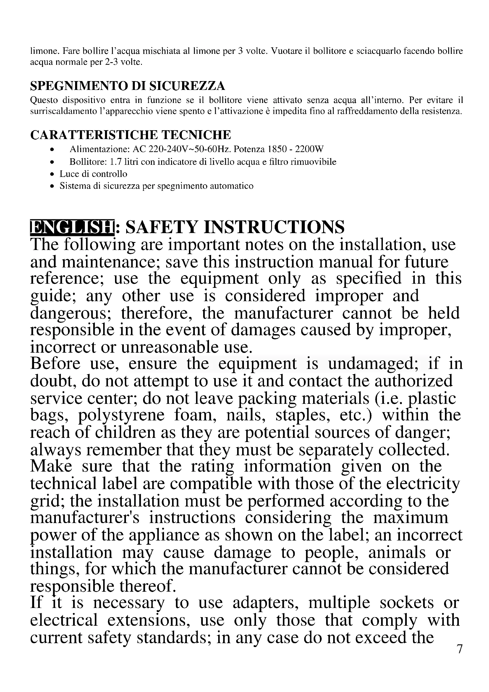 To prevent the formation of lime scale, it is recommended to make periodic special cleaning, following the instructions below: Pour water in the kettle until it reaches half the maximum capacity and add some lemon juice. Boil water mixed with lemon 3 times. Empty the kettle and rinse by boiling normal water for 2-3 times. SAFETY SWITCH-OFF The safety device is triggered if the kettle operates without water inside. To avoid overheating, the appliance is automatically turned off and cannot be activated until the complete cooling of the electric resistance.11 TECHNICAL FEATURES