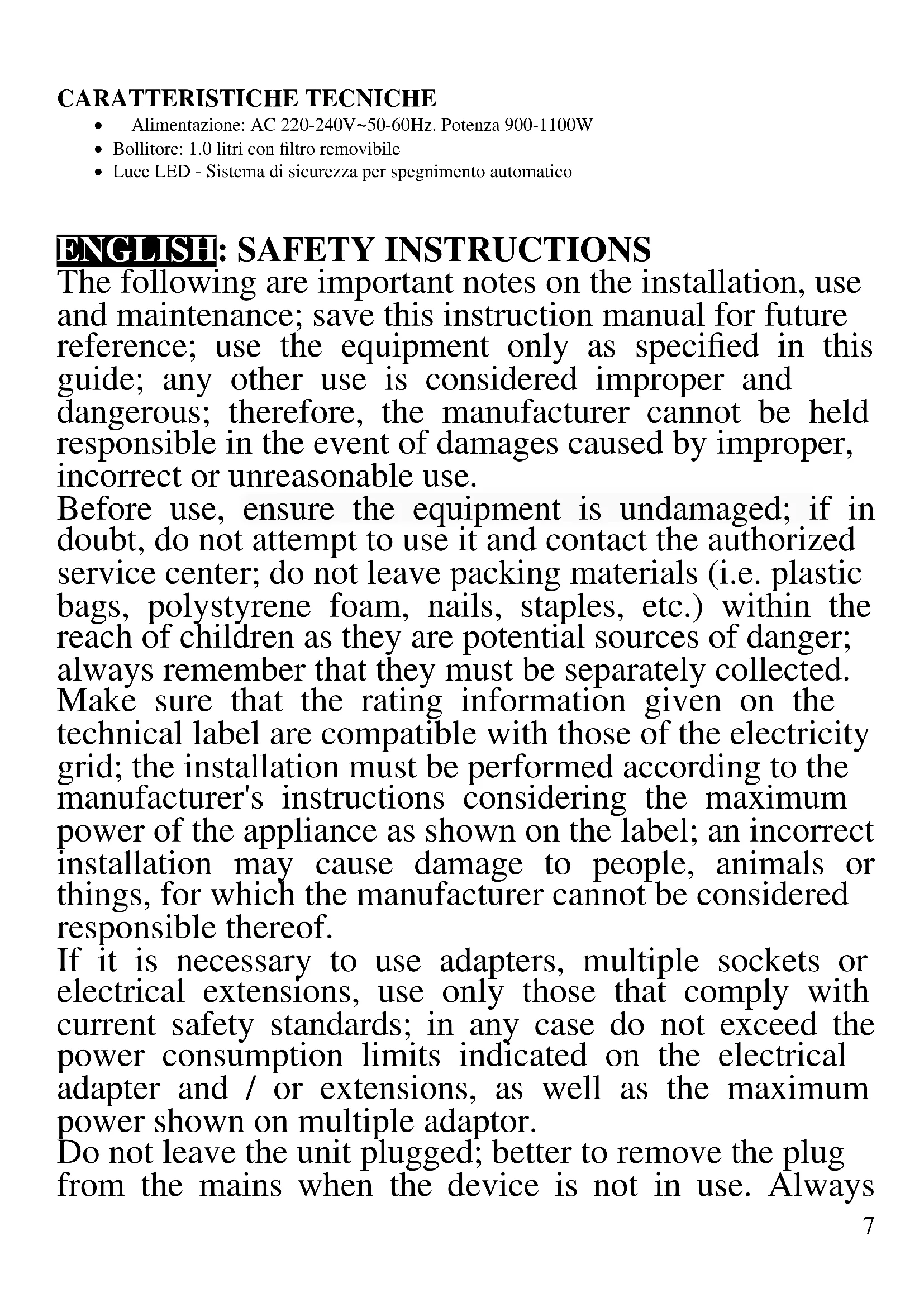 The following are important notes on the installation, use and maintenance; save this instruction manual for future reference; use the equipment only as specified in this guide; any other use is considered improper and dangerous; therefore, the manufacturer cannot be held responsible in the event of damages caused by improper, incorrect or unreasonable use. Before use, ensure the equipment is undamaged; if in doubt, do not attempt to use it and contact the authorized service center; do not leave packing materials (i.e. plastic bags, polystyrene foam, nails, staples, etc.) within the reach of children as they are potential sources of danger; always remember that they must be separately collected. Make sure that the rating information given on the technical label are compatible with those of the electricity grid; the installation must be performed according to the manufacturer's instructions considering the maximum power of the appliance as shown on the label; an incorrect installation may cause damage to people, animals or things, for which the manufacturer cannot be considered responsible thereof. If it is necessary to use adapters, multiple sockets or electrical extensions, use only those that comply with current safety standards; in any case do not exceed the power consumption limits indicated on the electrical adapter and / or extensions, as well as the maximum power shown on multiple adaptor. Do not leave the unit plugged; better to remove the plug from the mains when the device is not in use. Always8 disconnect from power supply if you leave it unattended. Cleaning operations should be carried out after unplugging the unit. If the unit is out of order and you do not want to fix it, it must be made inoperable by cutting power cord. - Do not allow the power cord to get closer to sharp objects or in contact with hot surfaces; do not pull it to disconnect the plug. - Do not use the appliance in the event of damage to the power cord, plug, or in case of short circuits; to repair the product only address an authorized service center. - Do not handle or touch the appliance with wet hands or bare feet. Do not expose the appliance to harmful weather conditions such as rain, moisture, frost, etc.. Always store it in a dry place. - This appliance can be used by children of 8 years and above and persons with reduced physical, sensory or mental capabilities or lack of experience and knowledge if they received supervision or instruction concerning use of the appliance in a safe way and understand hazards involved; children shall not play with the appliance; cleaning and user maintenance shall not be made by children without supervision. - Children must not play with the appliance. - Keep the appliance and its cord out of reach of children less than 8 years. If the power cord is damaged, or in case of failure and / or malfunction do not tamper with the unit. The reparation must be done by manufacturer or by service center authorized by the manufacturer in order to prevent any risk. Failure to comply with the above may compromise the unit safety and invalidate the warranty.