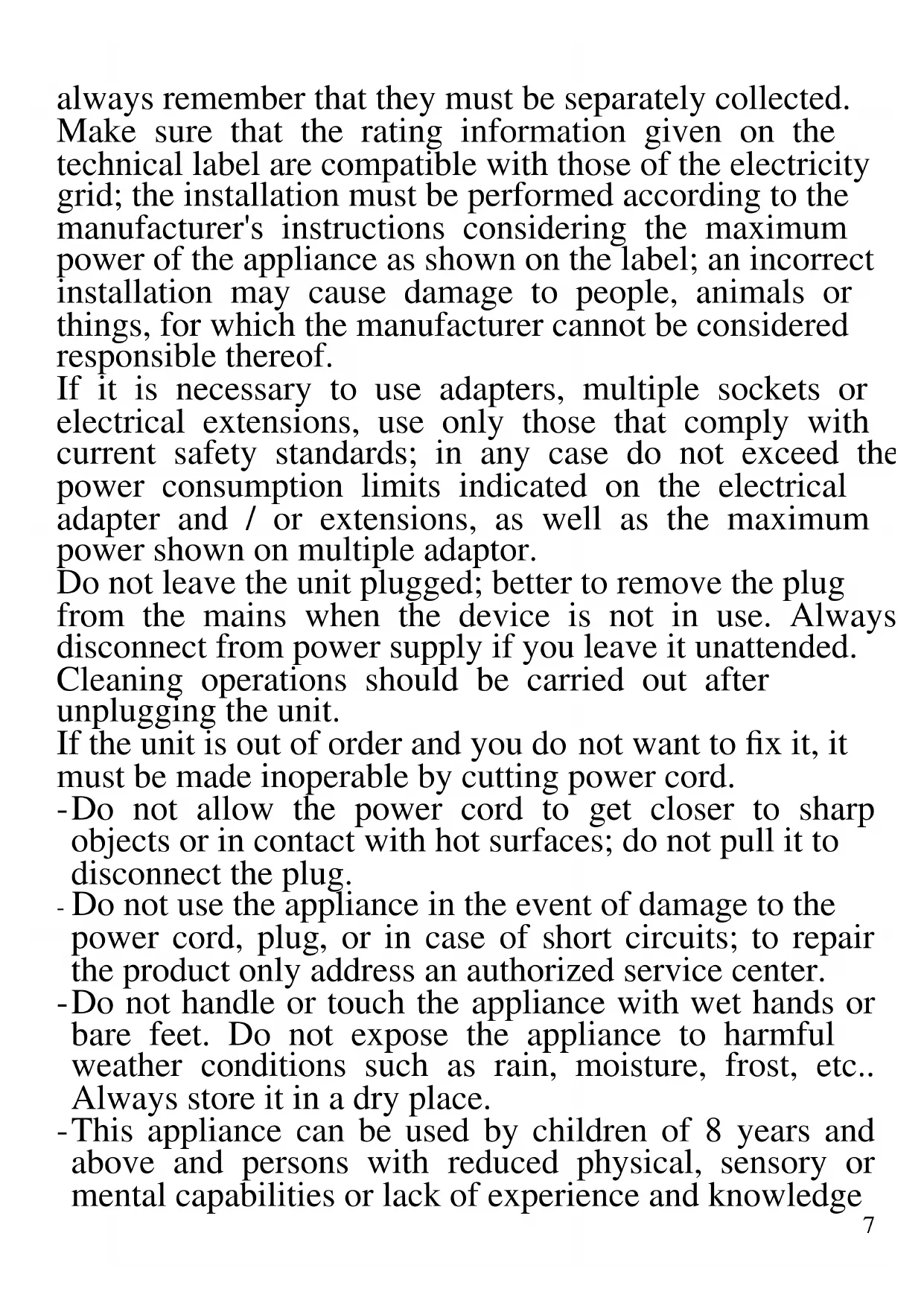 The following are important notes on the installation, use and maintenance; save this instruction manual for future reference; use the equipment only as specified in this guide; any other use is considered improper and dangerous; therefore, the manufacturer cannot be held responsible in the event of damages caused by improper, incorrect or unreasonable use. Before use, ensure the equipment is undamaged; if in doubt, do not attempt to use it and contact the authorized service center; do not leave packing materials (i.e. plastic bags, polystyrene foam, nails, staples, etc.) within the reach of children as they are potential sources of danger;7 always remember that they must be separately collected. Make sure that the rating information given on the technical label are compatible with those of the electricity grid; the installation must be performed according to the manufacturer's instructions considering the maximum power of the appliance as shown on the label; an incorrect installation may cause damage to people, animals or things, for which the manufacturer cannot be considered responsible thereof. If it is necessary to use adapters, multiple sockets or electrical extensions, use only those that comply with current safety standards; in any case do not exceed the power consumption limits indicated on the electrical adapter and / or extensions, as well as the maximum power shown on multiple adaptor. Do not leave the unit plugged; better to remove the plug from the mains when the device is not in use. Always disconnect from power supply if you leave it unattended. Cleaning operations should be carried out after unplugging the unit. If the unit is out of order and you do not want to fix it, it must be made inoperable by cutting power cord. - Do not allow the power cord to get closer to sharp objects or in contact with hot surfaces; do not pull it to disconnect the plug. - Do not use the appliance in the event of damage to the power cord, plug, or in case of short circuits; to repair the product only address an authorized service center. - Do not handle or touch the appliance with wet hands or bare feet. Do not expose the appliance to harmful weather conditions such as rain, moisture, frost, etc.. Always store it in a dry place. - This appliance can be used by children of 8 years and above and persons with reduced physical, sensory or mental capabilities or lack of experience and knowledge8 if they received supervision or instruction concerning use of the appliance in a safe way and understand hazards involved; children shall not play with the appliance; cleaning and user maintenance shall not be made by children without supervision. - Children must not play with the appliance. - Keep the appliance and its cord out of reach of children less than 8 years. If the power cord is damaged, or in case of failure and / or malfunction do not tamper with the unit. The reparation must be done by manufacturer or by service center authorized by the manufacturer in order to prevent any risk. Failure to comply with the above may compromise the unit safety and invalidate the warranty. - This appliance is intended to be used in household and similar applications such as: staff kitchen areas in shops, offices and other working environments; by clients in hotels, motels and other residential type environments; farm houses, bed and breakfast type environments. - The appliance is not intended to be operated by means of an external timer or separate remote-control system. - Before every use, unroll the power cord. - Use original spare parts and accessories only. - Do not subject the product to strong impacts, serious damages may result. - Do not use near or under flammable materials (like curtains), heat, cold spots and steam. GENERAL INSTRUCTIONS - Before using the unit for the first time, carefully wash the parts that come in touch with food such as the arm, filter, container, juicer spout and cones. - Before operating the juicer, make sure to place it on a flat and stable surface with no heat sources nearby. Assemble all parts properly before use.9 - Place a container under the spout when operating. - To avoid the overheating of the motor, do not use the appliance for more than 5 minutes continuously, then wait at least 5 minutes before operating. - Never leave the appliance unattended while it is running. - Disconnect electric plug from the socket after each use. - Do not immerse the motor unit in water or other liquids; clean it with a damp cloth. SR56 DESCRIPTION A) Arm B) Double juicing cone, small and big C) Filter D) Container E) Spout F) Motor body G) Base