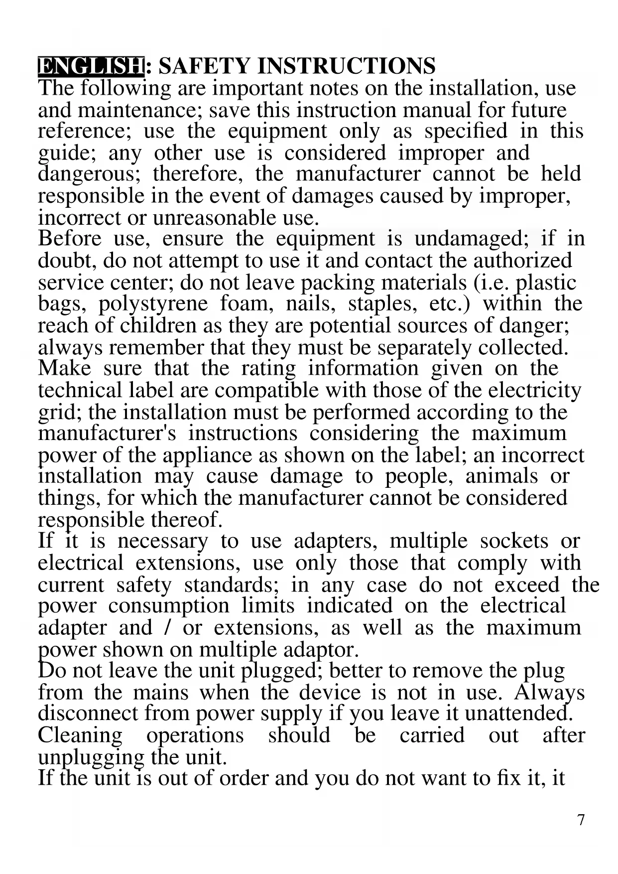 There are 2 couple of attachments included, since they have different use. Whips for beating The whips (9) are indicated for whipping, beating, emulsifying and must be used at higher speeds. Typical application are: mix and beat the eggs for preparing cakes and omelettes, beat the whites of eggs, prepare creams, emulsifying while preparing mayonnaise. Hooks for kneading The hooks for kneading (7) are suitable for cakes, pizzas or for kneading food in general. It is not recommended the use of the hooks if the dough has a heavy consistency. CLEANING Unplug the unit from the power outlet before starting cleaning operations. Do not immerse the motor unit in water, but wash it with a damp cloth and non-abrasive detergent. Also avoid any infiltration of water inside the motor housing. The attachments can be washed like every day crockery with non-abrasive sponge and dishwashing liquid or in the dishwasher. Completely dry all the accessories before assembling them again. TECHNICAL FEATURES