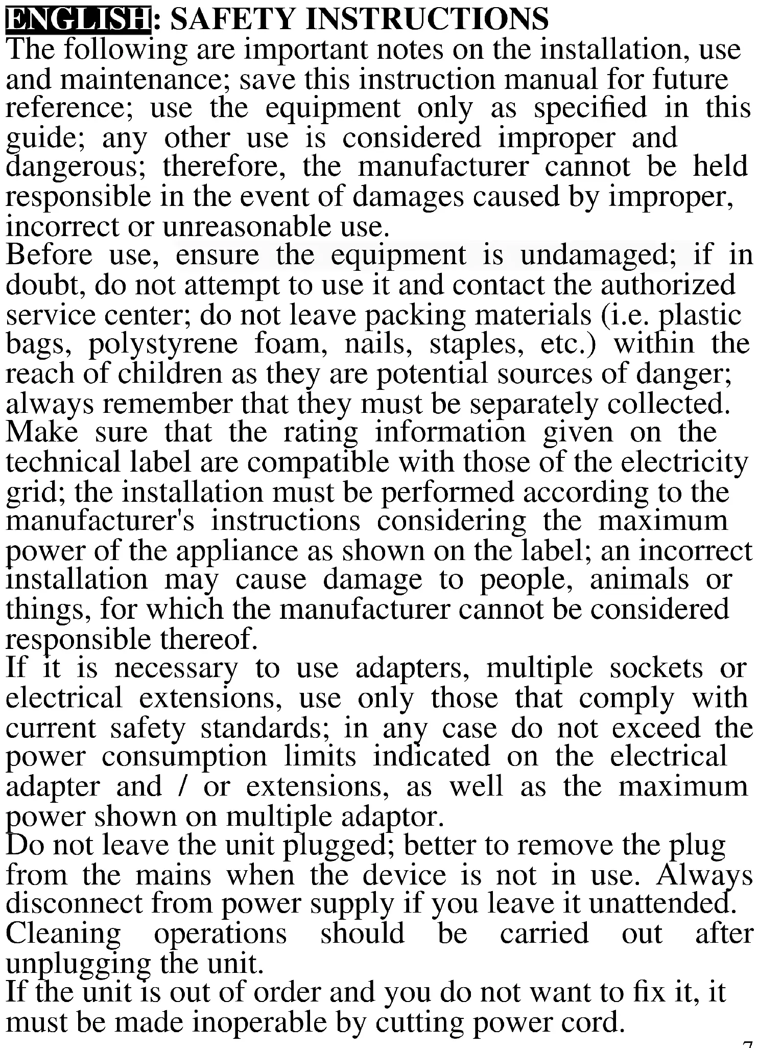 The following are important notes on the installation, use and maintenance; save this instruction manual for future reference; use the equipment only as specified in this guide; any other use is considered improper and dangerous; therefore, the manufacturer cannot be held responsible in the event of damages caused by improper, incorrect or unreasonable use. Before use, ensure the equipment is undamaged; if in doubt, do not attempt to use it and contact the authorized service center; do not leave packing materials (i.e. plastic bags, polystyrene foam, nails, staples, etc.) within the reach of children as they are potential sources of danger; always remember that they must be separately collected. Make sure that the rating information given on the technical label are compatible with those of the electricity grid; the installation must be performed according to the manufacturer's instructions considering the maximum power of the appliance as shown on the label; an incorrect installation may cause damage to people, animals or things, for which the manufacturer cannot be considered responsible thereof. If it is necessary to use adapters, multiple sockets or electrical extensions, use only those that comply with current safety standards; in any case do not exceed the power consumption limits indicated on the electrical adapter and / or extensions, as well as the maximum power shown on multiple adaptor. Do not leave the unit plugged; better to remove the plug from the mains when the device is not in use. Always disconnect from power supply if you leave it unattended. Cleaning operations should be carried out after unplugging the unit. If the unit is out of order and you do not want to fix it, it must be made inoperable by cutting power cord.8 - Do not allow the power cord to get closer to sharp objects or in contact with hot surfaces; do not pull it to disconnect the plug. - Do not use the appliance in the event of damage to the power cord, plug, or in case of short circuits; to repair the product only address an authorized service center. - Do not handle or touch the appliance with wet hands or bare feet. Do not expose the appliance to harmful weather conditions such as rain, moisture, frost, etc.. Always store it in a dry place. - This appliance cannot be used by children, even if they're more than 8 years old. - This appliance can be used by persons with reduced physical, sensory or mental capabilities or lack of experience and knowledge if they received supervision or instruction concerning use of appliance in a safe way and understand the hazards involved. - Children must not play with the appliance. - Keep the appliance and its cord out of reach of children less than 8 years. If the power cord is damaged, or in case of failure and / or malfunction do not tamper with the unit. The reparation must be done by manufacturer or by service center authorized by the manufacturer in order to prevent any risk. Failure to comply with the above may compromise the unit safety and invalidate the warranty. - This appliance is intended to be used in household and similar applications such as: staff kitchen areas in shops, offices and other working environments; by clients in hotels, motels and other residential type environments; farm houses, bed and breakfast type environments. - The appliance is not intended to be operated by means of an external timer or separate remote-control system. - Before every use, unroll the power cord. - Use original spare parts and accessories only.9 - Do not subject the product to strong impacts, serious damages may result. - Do not use near or under flammable materials (like curtains), heat, cold spots and steam. GENERAL INSTRUCTIONS The blades of the hand blender are very sharp to chop: Be careful not to cut yourself during cleaning operations and/or when removing the attachments. To avoid the overheating of the motor, do not use the appliance running continuously for more than 30 seconds, then make at least 5 minutes rest. Do not use the product without food. Do not insert your fingers inside the bowl while the mixer is running. Before using for the first time, carefully wash the parts that will be in touch with food: immersion cone, accessories and blades. Before operating the appliance, check that all the parts are correctly installed. Never leave the appliance unattended while it is running. CAUTION! Unplug the unit from the socket before touching the blades for any reason, such as cleaning or foods removing. CAUTION! Always unplug the unit from the electrical outlet each after use and/or before touching the blades and/or before installing or removing any accessory or attachment. To clean the immersion cone and the accessories, it is recommended using warm tap water and containing the use of detergents. When gleaning with detergents, rinse thoroughly. Do not immerse the top of the mixer in water or other liquids, clean it with a damp cloth.10 PARTS MX02