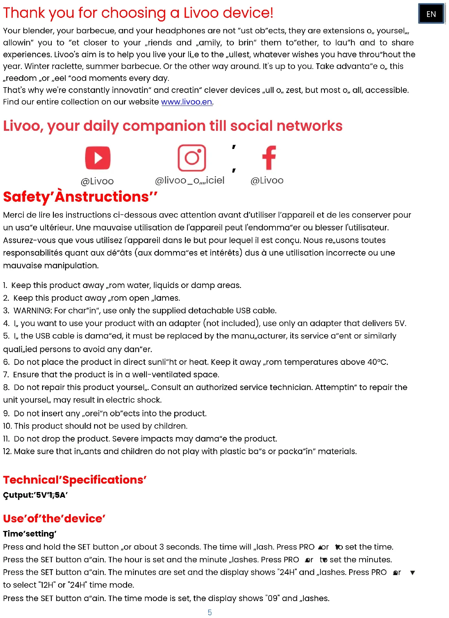 Technical Specifications Output: 5V 1,5A Use of the device Time setting Press and hold the SET button for about 3 seconds. The time will flash. Press PRO or to set the time. Press the SET button again. The hour is set and the minute flashes. Press PRO or to set the minutes. Press the SET button again. The minutes are set and the display shows "24H" and flashes. Press PRO or to select "12H" or "24H" time mode. Press the SET button again. The time mode is set, the display shows "09" and flashes. @livoo_officiel
