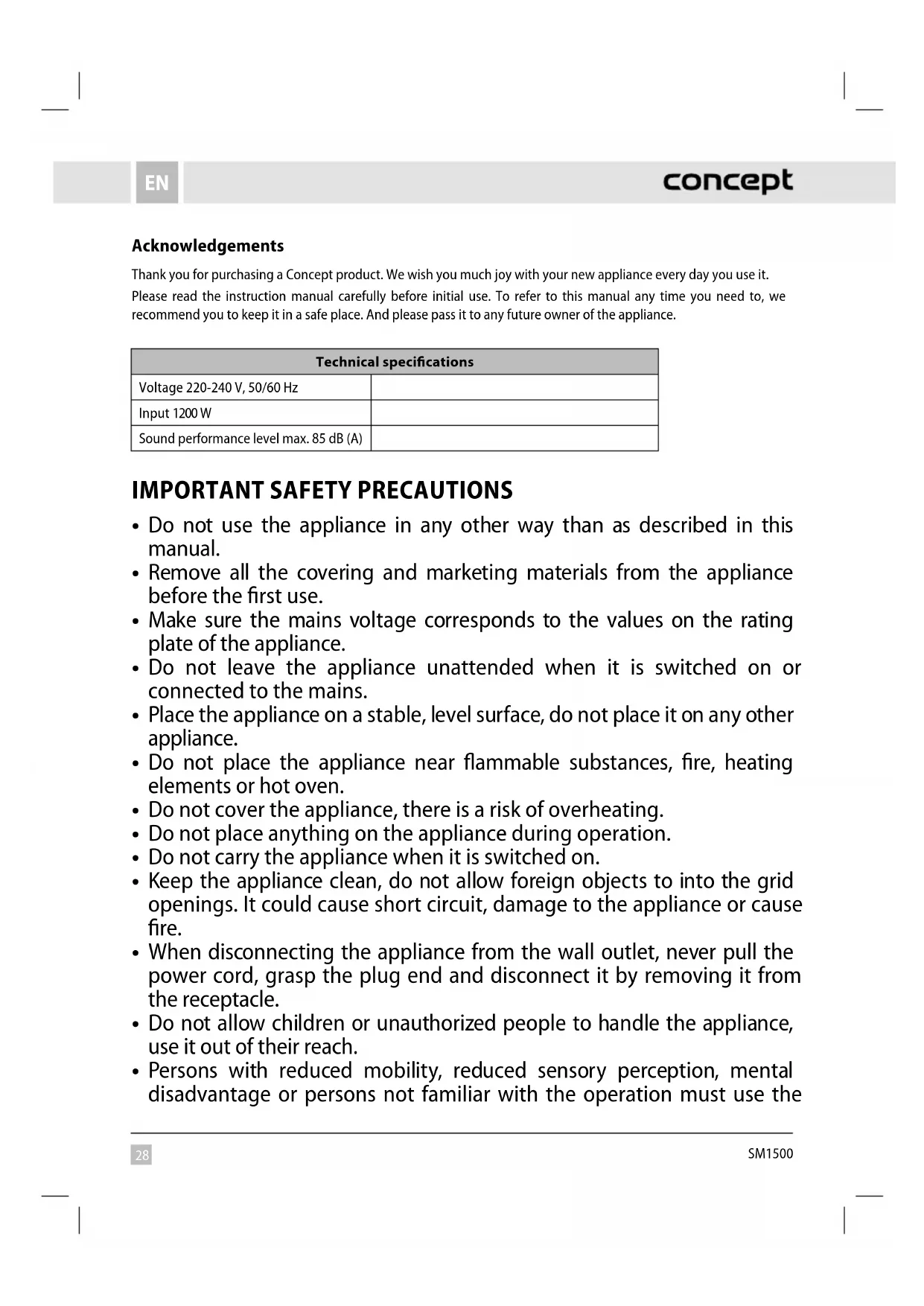 Acknowledgements Thank you for purchasing a Concept product. We wish you much joy with your new appliance every day you use it. Please read the instruction manual carefully before initial use. To refer to this manual any time you need to, we recommend you to keep it in a safe place. And please pass it to any future owner of the appliance. Technical specications Voltage 220-240 V, 50/60 Hz Input 1200 W Sound performance level max. 85 dB (A)