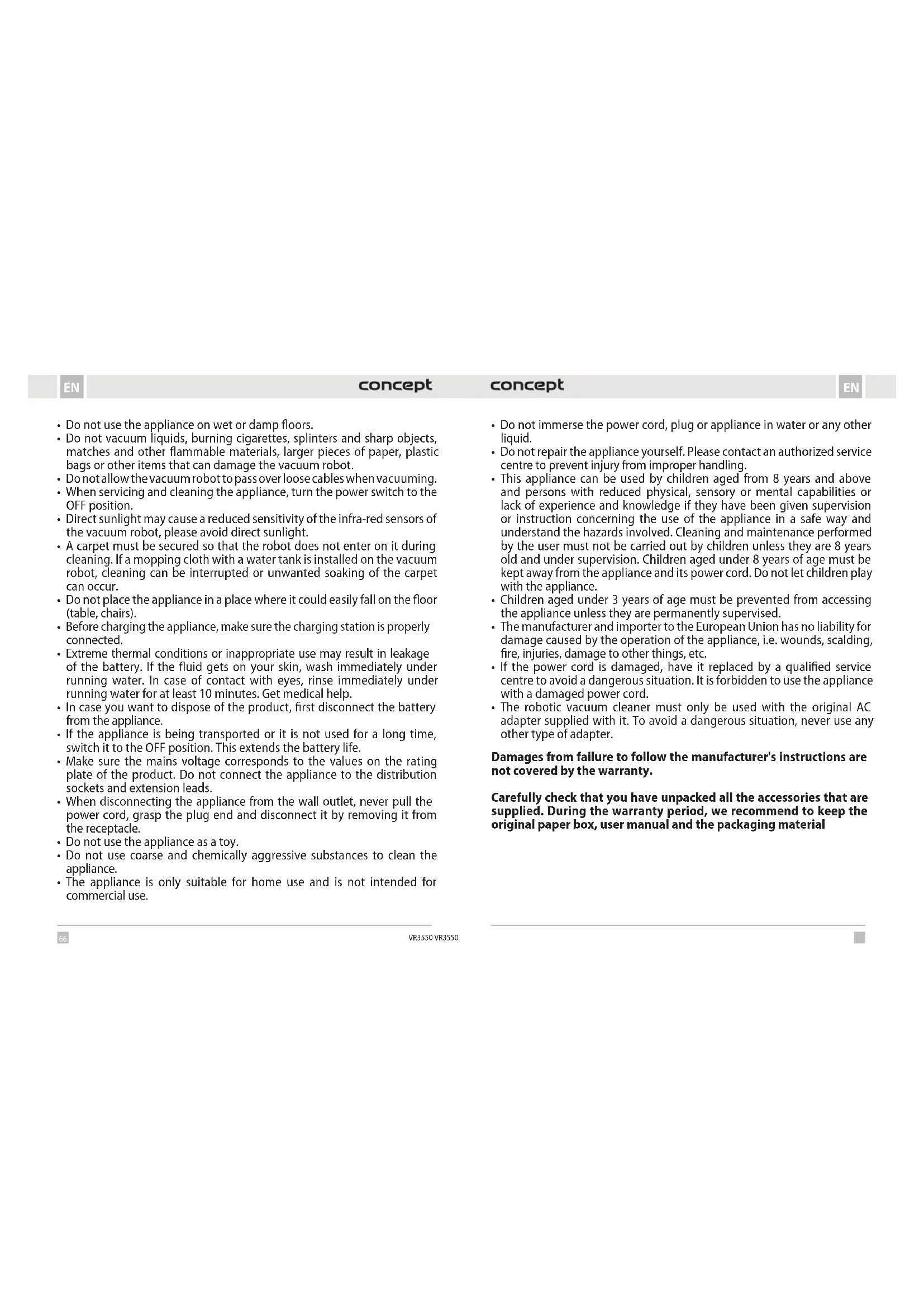 - Do not put your hair, clothes, fingers or other body parts near the main brush. Keep the main brush and the suction part of the vacuum robot clean, remove all hair and dust that can lower the suction properties of the vacuum robot and the cleaning quality.66 67 ENEN VR3550 VR3550