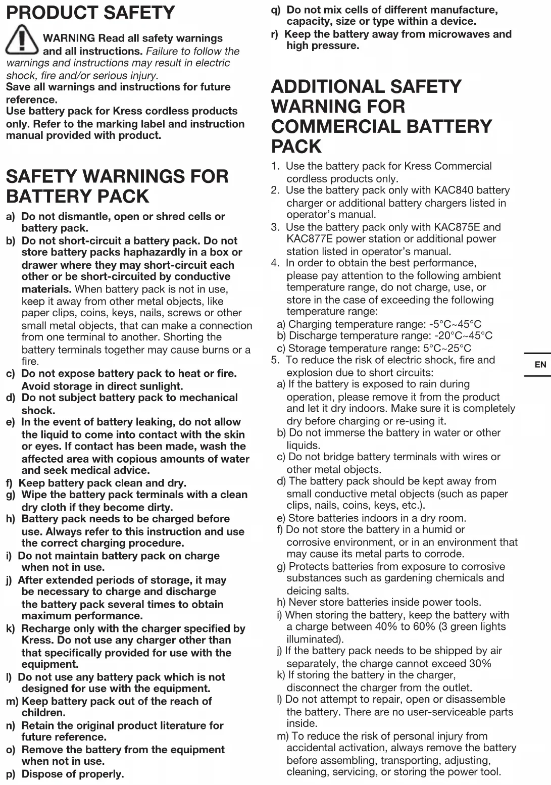 when not in use. j) After extended periods of storage, it may be necessary to charge and discharge the battery pack several times to obtain maximum performance. k) Recharge only with the charger specified by Kress. Do not use any charger other than that specifically provided for use with the equipment. l) Do not use any battery pack which is not designed for use with the equipment. m) Keep battery pack out of the reach of children. n) Retain the original product literature for future reference. o) Remove the battery from the equipment when not in use. p) Dispose of properly. q) Do not mix cells of different manufacture, capacity, size or type within a device. r) Keep the battery away from microwaves and high pressure. ADDITIONAL SAFETY WARNING FOR COMMERCIAL BATTERY PACK