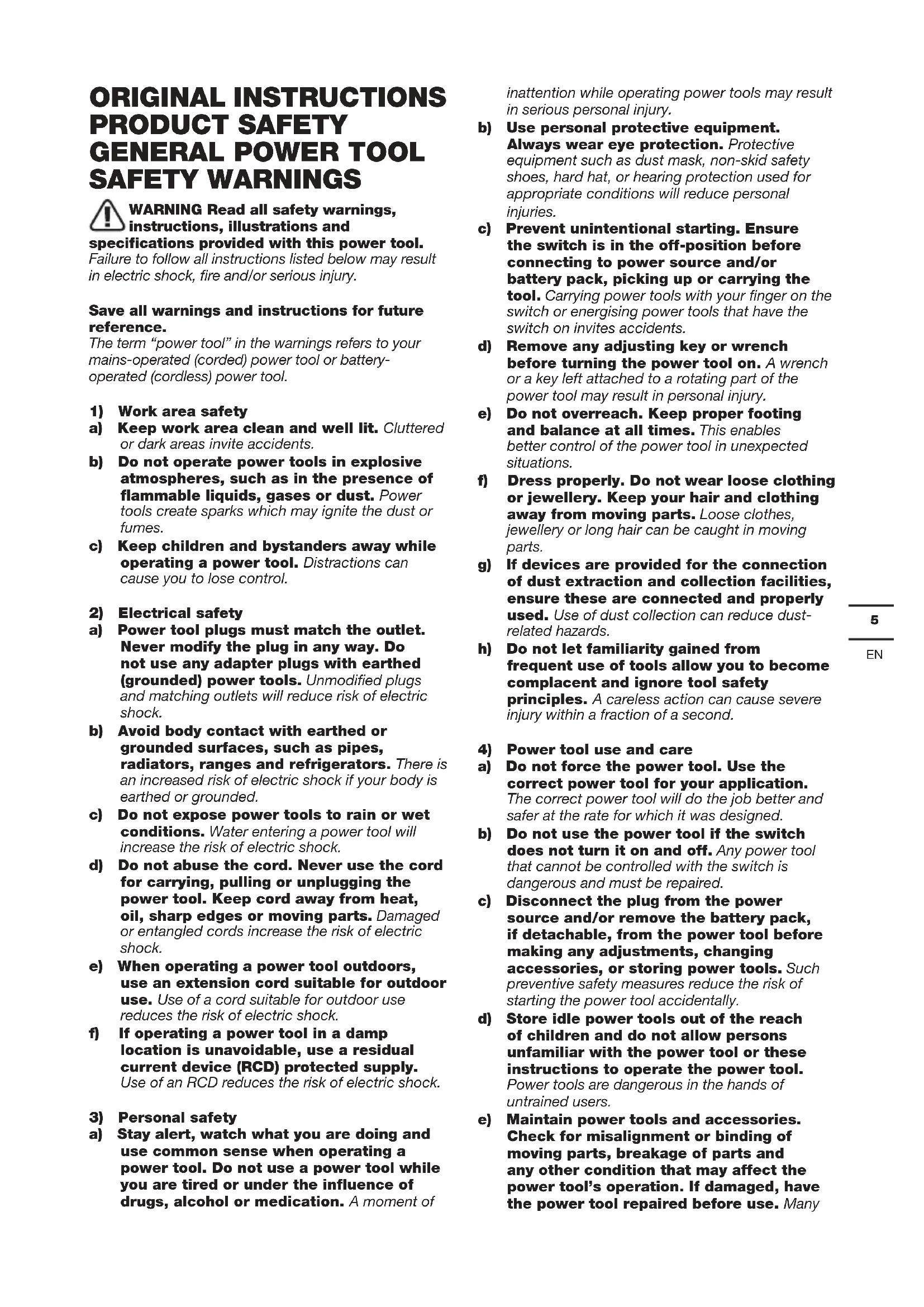 a) Power tool plugs must match the outlet. Never modify the plug in any way. Do not use any adapter plugs with earthed (grounded) power tools. Unmodified plugs and matching outlets will reduce risk of electric shock. b) Avoid body contact with earthed or grounded surfaces, such as pipes, radiators, ranges and refrigerators. There is an increased risk of electric shock if your body is earthed or grounded. c) Do not expose power tools to rain or wet conditions. Water entering a power tool will increase the risk of electric shock. d) Do not abuse the cord. Never use the cord for carrying, pulling or unplugging the power tool. Keep cord away from heat, oil, sharp edges or moving parts. Damaged or entangled cords increase the risk of electric shock. e) When operating a power tool outdoors, use an extension cord suitable for outdoor use. Use of a cord suitable for outdoor use reduces the risk of electric shock. f) If operating a power tool in a damp location is unavoidable, use a residual current device (RCD) protected supply. Use of an RCD reduces the risk of electric shock.