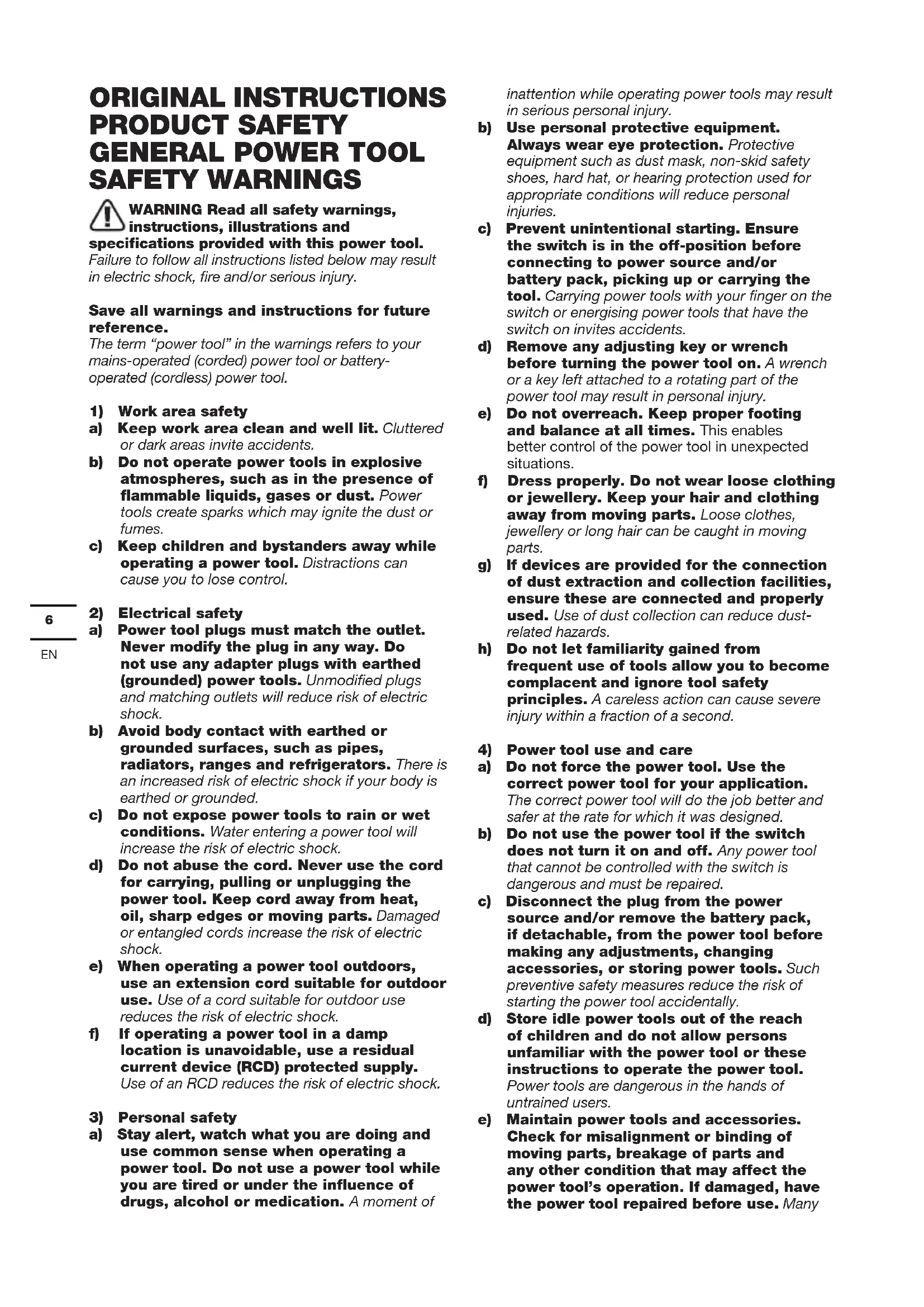 a) Stay alert, watch what you are doing and use common sense when operating a power tool. Do not use a power tool while you are tired or under the influence of drugs, alcohol or medication. A moment of inattention while operating power tools may result in serious personal injury. b) Use personal protective equipment. Always wear eye protection. Protective equipment such as dust mask, non-skid safety shoes, hard hat, or hearing protection used for appropriate conditions will reduce personal injuries. c) Prevent unintentional starting. Ensure the switch is in the off-position before connecting to power source and/or battery pack, picking up or carrying the tool. Carrying power tools with your finger on the switch or energising power tools that have the switch on invites accidents. d) Remove any adjusting key or wrench before turning the power tool on. A wrench or a key left attached to a rotating part of the power tool may result in personal injury. e) Do not overreach. Keep proper footing and balance at all times. This enables better control of the power tool in unexpected situations. f) Dress properly. Do not wear loose clothing or jewellery. Keep your hair and clothing away from moving parts. Loose clothes, jewellery or long hair can be caught in moving parts. g) If devices are provided for the connection of dust extraction and collection facilities, ensure these are connected and properly used. Use of dust collection can reduce dust- related hazards. h) Do not let familiarity gained from frequent use of tools allow you to become complacent and ignore tool safety principles. A careless action can cause severe injury within a fraction of a second.