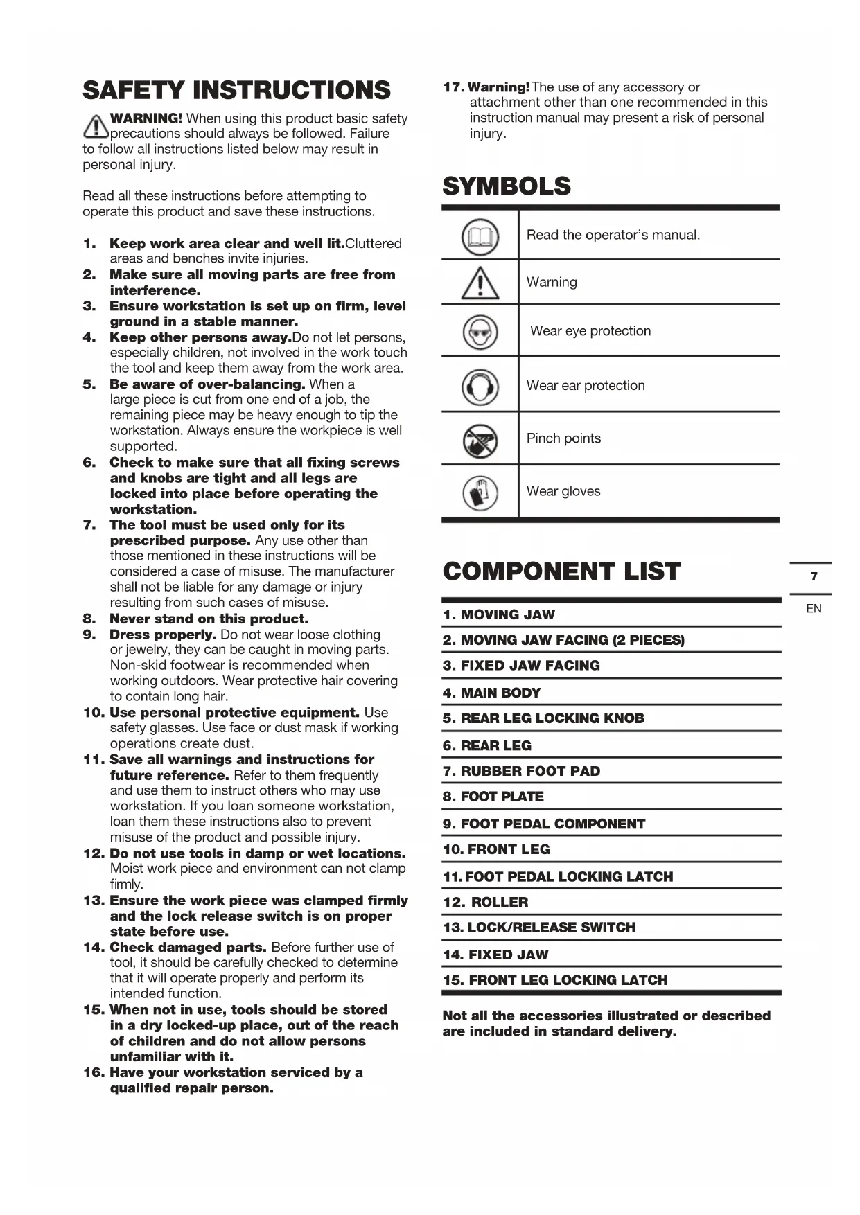 NOTE: Before using the tool, read the instruction book carefully. INTENDED USE The workbench is a versatile workstation for holding, clamping, supporting.