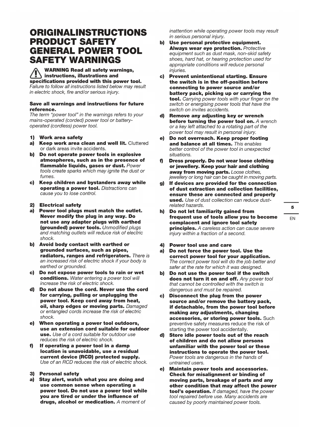 a) Stay alert, watch what you are doing and use common sense when operating a power tool. Do not use a power tool while you are tired or under the influence of drugs, alcohol or medication. A moment of inattention while operating power tools may result in serious personal injury. b) Use personal protective equipment. Always wear eye protection. Protective equipment such as dust mask, non-skid safety shoes, hard hat, or hearing protection used for appropriate conditions will reduce personal injuries. c) Prevent unintentional starting. Ensure the switch is in the off-position before connecting to power source and/or battery pack, picking up or carrying the tool. Carrying power tools with your finger on the switch or energising power tools that have the switch on invites accidents. d) Remove any adjusting key or wrench before turning the power tool on. A wrench or a key left attached to a rotating part of the power tool may result in personal injury. e) Do not overreach. Keep proper footing and balance at all times. This enables better control of the power tool in unexpected situations. f) Dress properly. Do not wear loose clothing or jewellery. Keep your hair and clothing away from moving parts. Loose clothes, jewellery or long hair can be caught in moving parts. g) If devices are provided for the connection of dust extraction and collection facilities, ensure these are connected and properly used. Use of dust collection can reduce dust- related hazards. h) Do not let familiarity gained from frequent use of tools allow you to become complacent and ignore tool safety principles. A careless action can cause severe injury within a fraction of a second.