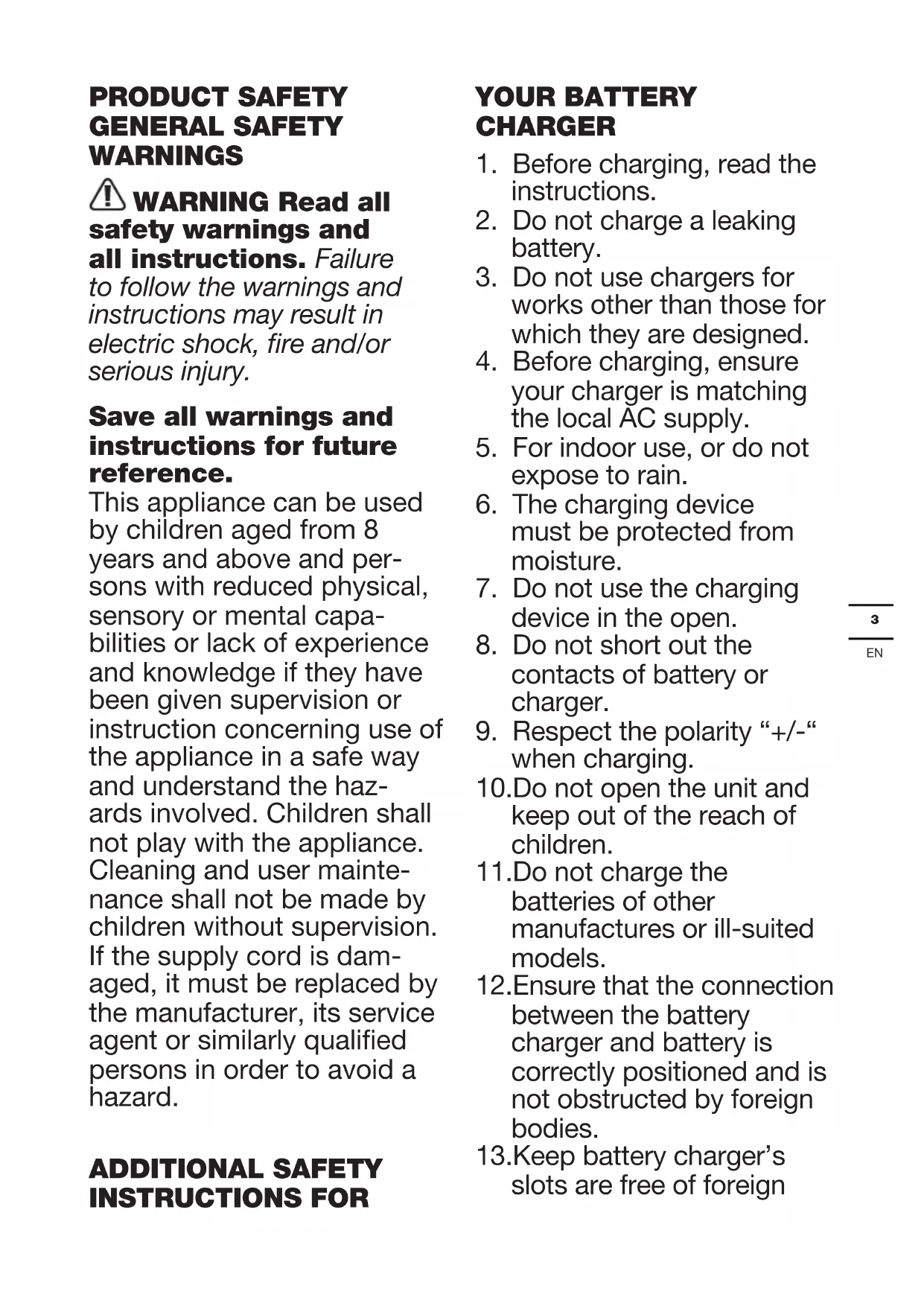 PRODUCT SAFETY GENERAL SAFETY WARNINGS WARNING Read all safety warnings and all instructions. Failure to follow the warnings and instructions may result in electric shock, fire and/or serious injury. Save all warnings and instructions for future reference. This appliance can be used by children aged from 8 years and above and per- sons with reduced physical, sensory or mental capa- bilities or lack of experience and knowledge if they have been given supervision or instruction concerning use of the appliance in a safe way and understand the haz- ards involved. Children shall not play with the appliance. Cleaning and user mainte- nance shall not be made by children without supervision. If the supply cord is dam- aged, it must be replaced by the manufacturer, its service agent or similarly qualied persons in order to avoid a hazard. ADDITIONAL SAFETY INSTRUCTIONS FOR YOUR BATTERY CHARGER