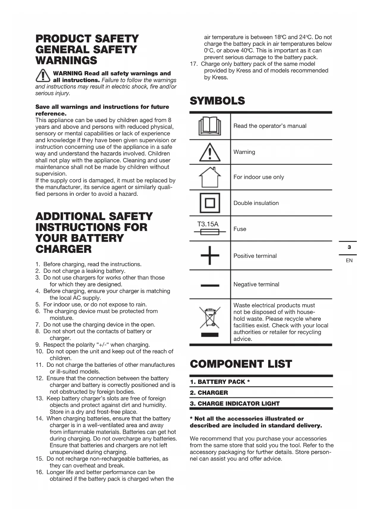 provided by Kress and of models recommended by Kress. SYMBOLS Read the operator’s manual Warning For indoor use only Double insulation T3.15A Fuse Positive terminal Negative terminal Waste electrical products must not be disposed of with house- hold waste. Please recycle where facilities exist. Check with your local authorities or retailer for recycling advice. COMPONENT LIST
