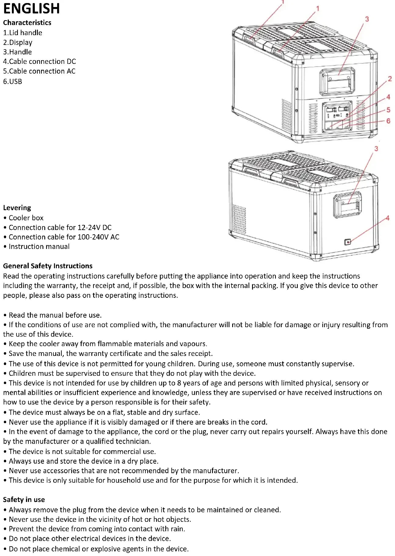 - Do not switch the appliance on immediately after you transport it, where the cool box has been tilted more than -30°. This could cause damage to the cooling system. The device must first stand upright for 24 hours so that the coolant can be collected again in the compressor. This prevents the compressor from running dry.