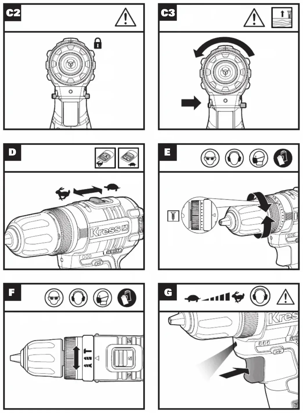 of rotation can not be changed until the machine is completely stationary. See Figure C1,C2,C3 SPEED SHIFT See Figure D TORSION ADJUSTMENT Torque selection The tripping torsion corresponding to position 1 is the smallest, and that corresponding to position 20 is the largest. See Figure E Mode switch Drilling mode Screw batch mode Hammer drill mode (drilling on lightweight concrete and brick walls) See Figure F Start/stop