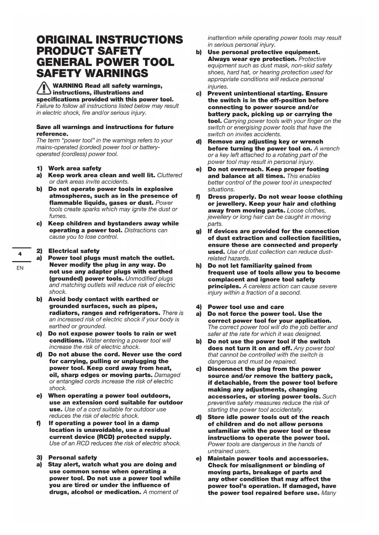 a) Stay alert, watch what you are doing and use common sense when operating a power tool. Do not use a power tool while you are tired or under the influence of drugs, alcohol or medication. A moment of inattention while operating power tools may result in serious personal injury. b) Use personal protective equipment. Always wear eye protection. Protective equipment such as dust mask, non-skid safety shoes, hard hat, or hearing protection used for appropriate conditions will reduce personal injuries. c) Prevent unintentional starting. Ensure the switch is in the off-position before connecting to power source and/or battery pack, picking up or carrying the tool. Carrying power tools with your finger on the switch or energising power tools that have the switch on invites accidents. d) Remove any adjusting key or wrench before turning the power tool on. A wrench or a key left attached to a rotating part of the power tool may result in personal injury. e) Do not overreach. Keep proper footing and balance at all times. This enables better control of the power tool in unexpected situations. f) Dress properly. Do not wear loose clothing or jewellery. Keep your hair and clothing away from moving parts. Loose clothes, jewellery or long hair can be caught in moving parts. g) If devices are provided for the connection of dust extraction and collection facilities, ensure these are connected and properly used. Use of dust collection can reduce dust- related hazards. h) Do not let familiarity gained from frequent use of tools allow you to become complacent and ignore tool safety principles. A careless action can cause severe injury within a fraction of a second.