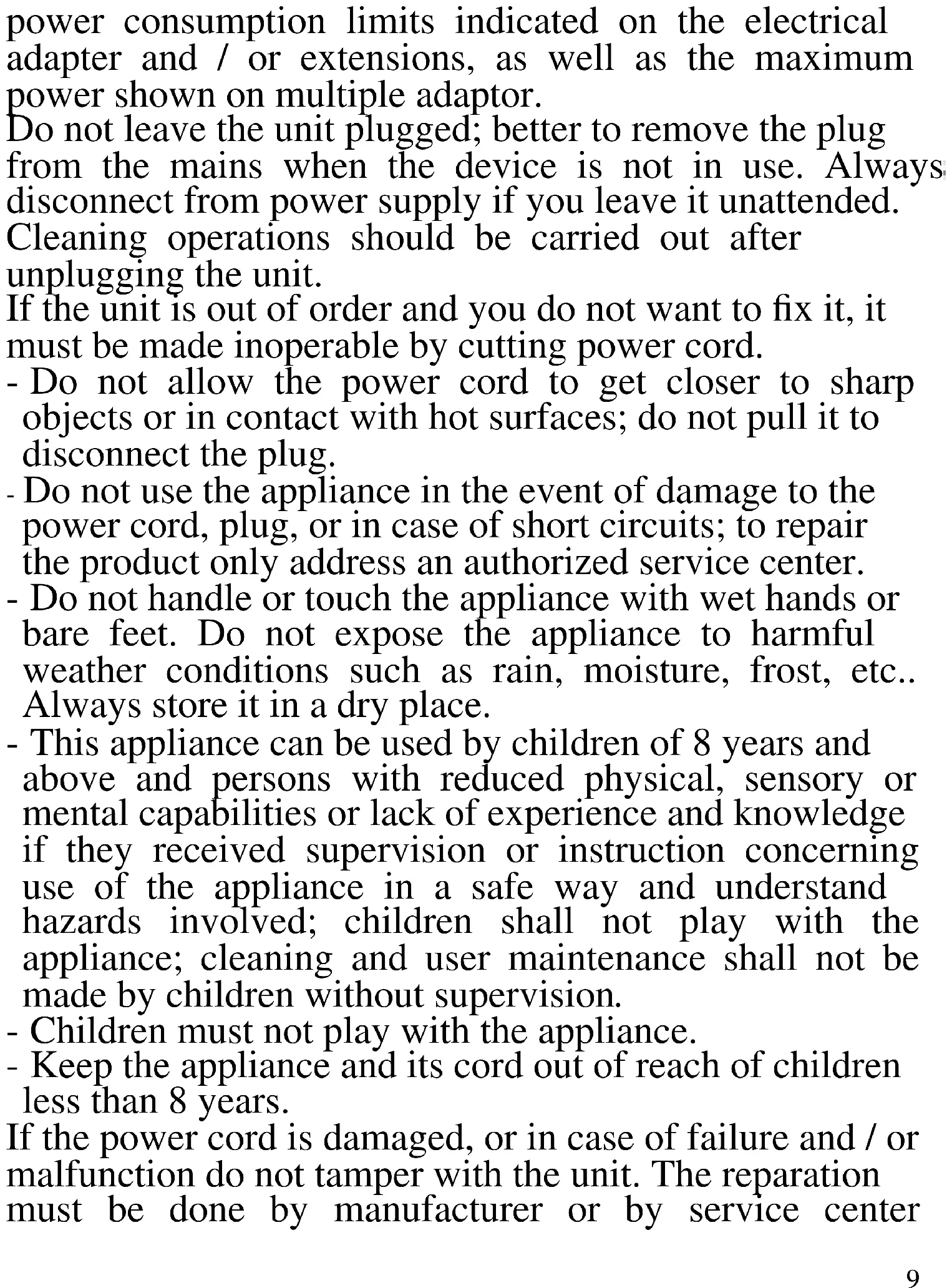 The following are important notes on the installation, use and maintenance; save this instruction manual for future reference; use the equipment only as specified in this guide; any other use is considered improper and dangerous; therefore, the manufacturer cannot be held responsible in the event of damages caused by improper, incorrect or unreasonable use. Before use, ensure the equipment is undamaged; if in doubt, do not attempt to use it and contact the authorized service center; do not leave packing materials (i.e. plastic bags, polystyrene foam, nails, staples, etc.) within the reach of children as they are potential sources of danger; always remember that they must be separately collected. Make sure that the rating information given on the technical label are compatible with those of the electricity grid; the installation must be performed according to the manufacturer's instructions considering the maximum power of the appliance as shown on the label; an incorrect installation may cause damage to people, animals or things, for which the manufacturer cannot be considered responsible thereof. If it is necessary to use adapters, multiple sockets or electrical extensions, use only those that comply with current safety standards; in any case do not exceed the9 power consumption limits indicated on the electrical adapter and / or extensions, as well as the maximum power shown on multiple adaptor. Do not leave the unit plugged; better to remove the plug from the mains when the device is not in use. Always disconnect from power supply if you leave it unattended. Cleaning operations should be carried out after unplugging the unit. If the unit is out of order and you do not want to fix it, it must be made inoperable by cutting power cord. - Do not allow the power cord to get closer to sharp objects or in contact with hot surfaces; do not pull it to disconnect the plug. - Do not use the appliance in the event of damage to the power cord, plug, or in case of short circuits; to repair the product only address an authorized service center. - Do not handle or touch the appliance with wet hands or bare feet. Do not expose the appliance to harmful weather conditions such as rain, moisture, frost, etc.. Always store it in a dry place. - This appliance can be used by children of 8 years and above and persons with reduced physical, sensory or mental capabilities or lack of experience and knowledge if they received supervision or instruction concerning use of the appliance in a safe way and understand hazards involved; children shall not play with the appliance; cleaning and user maintenance shall not be made by children without supervision. - Children must not play with the appliance. - Keep the appliance and its cord out of reach of children less than 8 years. If the power cord is damaged, or in case of failure and / or malfunction do not tamper with the unit. The reparation must be done by manufacturer or by service center10 authorized by the manufacturer in order to prevent any risk. Failure to comply with the above may compromise the unit safety and invalidate the warranty.