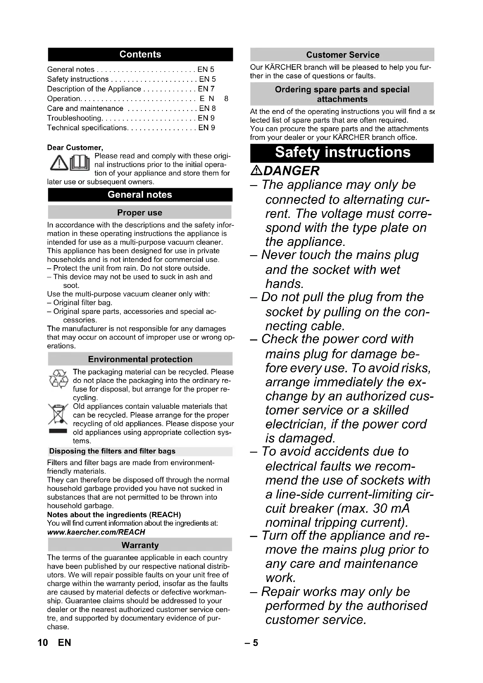 Netzkabel H 05VV-F2x0,75 Gewicht (ohne Zubehör) 5,5 kg Schalldruckpegel (EN 60704-2-1) 75 dB(A) 9DE– 5 Dear Customer, Please read and comply with these origi- nal instructions prior to the initial opera- tion of your appliance and store them for later use or subsequent owners. In accordance with the descriptions and the safety infor- mation in these operating instructions the appliance is intended for use as a multi-purpose vacuum cleaner. This appliance has been designed for use in private households and is not intended for commercial use. – Protect the unit from rain. Do not store outside. – This device may not be used to suck in ash and soot. Use the multi-purpose vacuum cleaner only with: – Original filter bag. – Original spare parts, accessories and special ac- cessories. The manufacturer is not responsible for any damages that may occur on account of improper use or wrong op- erations. The packaging material can be recycled. Please do not place the packaging into the ordinary re- fuse for disposal, but arrange for the proper re- cycling. Old appliances contain valuable materials that can be recycled. Please arrange for the proper recycling of old appliances. Please dispose your old appliances using appropriate collection sys- tems. Filters and filter bags are made from environment- friendly materials. They can therefore be disposed off through the normal household garbage provided you have not sucked in substances that are not permitted to be thrown into household garbage. Notes about the ingredients (REACH) You will find current information about the ingredients at: www.kaercher.com/REACH The terms of the guarantee applicable in each country have been published by our respective national distrib- utors. We will repair possible faults on your unit free of charge within the warranty period, insofar as the faults are caused by material defects or defective workman- ship. Guarantee claims should be addressed to your dealer or the nearest authorized customer service cen- tre, and supported by documentary evidence of pur- chase. Our KÄRCHER branch will be pleased to help you fur- ther in the case of questions or faults. At the end of the operating instructions you will find a se- lected list of spare parts that are often required. You can procure the spare parts and the attachments from your dealer or your KÄRCHER branch office. DANGER – The appliance may only be connected to alternating cur- rent. The voltage must corre- spond with the type plate on the appliance. – Never touch the mains plug and the socket with wet hands. – Do not pull the plug from the socket by pulling on the con- necting cable. – Check the power cord with mains plug for damage be- fore every use. To avoid risks, arrange immediately the ex- change by an authorized cus- tomer service or a skilled electrician, if the power cord is damaged. – To avoid accidents due to electrical faults we recom- mend the use of sockets with a line-side current-limiting cir- cuit breaker (max. 30 mA nominal tripping current). – Turn off the appliance and re- move the mains plug prior to any care and maintenance work. – Repair works may only be performed by the authorised customer service. Contents General notes ... EN 5 Safety instructions ... EN 5 Description of the Appliance ... EN 7 Operation...EN 8 Care and maintenance ... EN 8 Troubleshooting... EN 9 Technical specifications... EN 9 General notes Proper use Environmental protection Disposing the filters and filter bags Warranty Customer Service Ordering spare parts and special attachments Safety instructions 10 EN– 6 WARNING – This appliance is not intended for use by persons with limit- ed physical, sensory or men- tal capacities or lacking expe- rience and/or skills, unless such persons are accompa- nied and supervised by a per- son in charge of their safety or they have received precise instructions on the use of this appliance and have under- stood the resulting risks. – Children may only use this appliance if they are over the age of 8 and supervised by a person in charge of their safe- ty, or if they have received in- structions on the use of this appliance and have under- stood the resulting risks. – Children must not play with this appliance. – Supervise children to prevent them from playing with the appliance. – Cleaning and user mainte- nance must not be performed by children without supervi- sion. – Keep packaging film away from children - risk of suffoca- tion! – Switch the appliance off after every use and prior to every cleaning/maintenance proce- dure. – Risk of fire. Do not vacuum up any burning or glowing ob- jects. – The appliance may not be used in areas where a risk of explosion is present. – Immediately switch the appli- ance off or pull the power plug if foam forms or liquids es- cape! – Do not use abrasives, glass or universal cleaners! Never immerse the appliance in wa- ter. Certain materials may produce explosive vapours or mixtures when agitated by the suction air! Never vacuum up the following materials: – Explosive or combustible gases, liquids and dust parti- cles (reactive dust particles) – Reactive metal dust particles (such as aluminium, magne- sium, zinc) in combination with highly alkaline or acidic detergents – Undiluted, strong acids and alkalies – Organic solvents (such as petrol, paint thinners, ace- tone, heating oil). In addition, these substances may cause the appliance materi- als to corrode. DANGER Pointer to immediate danger, which leads to severe injuries or death. 몇 WARNING Pointer to a possibly dangerous situation, which can lead to se- vere injuries or death. Hazard levels 11EN– 7 몇 CAUTION Pointer to a possibly dangerous situation, which can lead to mi- nor injuries. ATTENTION Pointer to a possibly dangerous situation, which can lead to property damage. Illustrations on fold-out page! These operating instructions describe the multi-purpose vacuum cleaner shown on the co