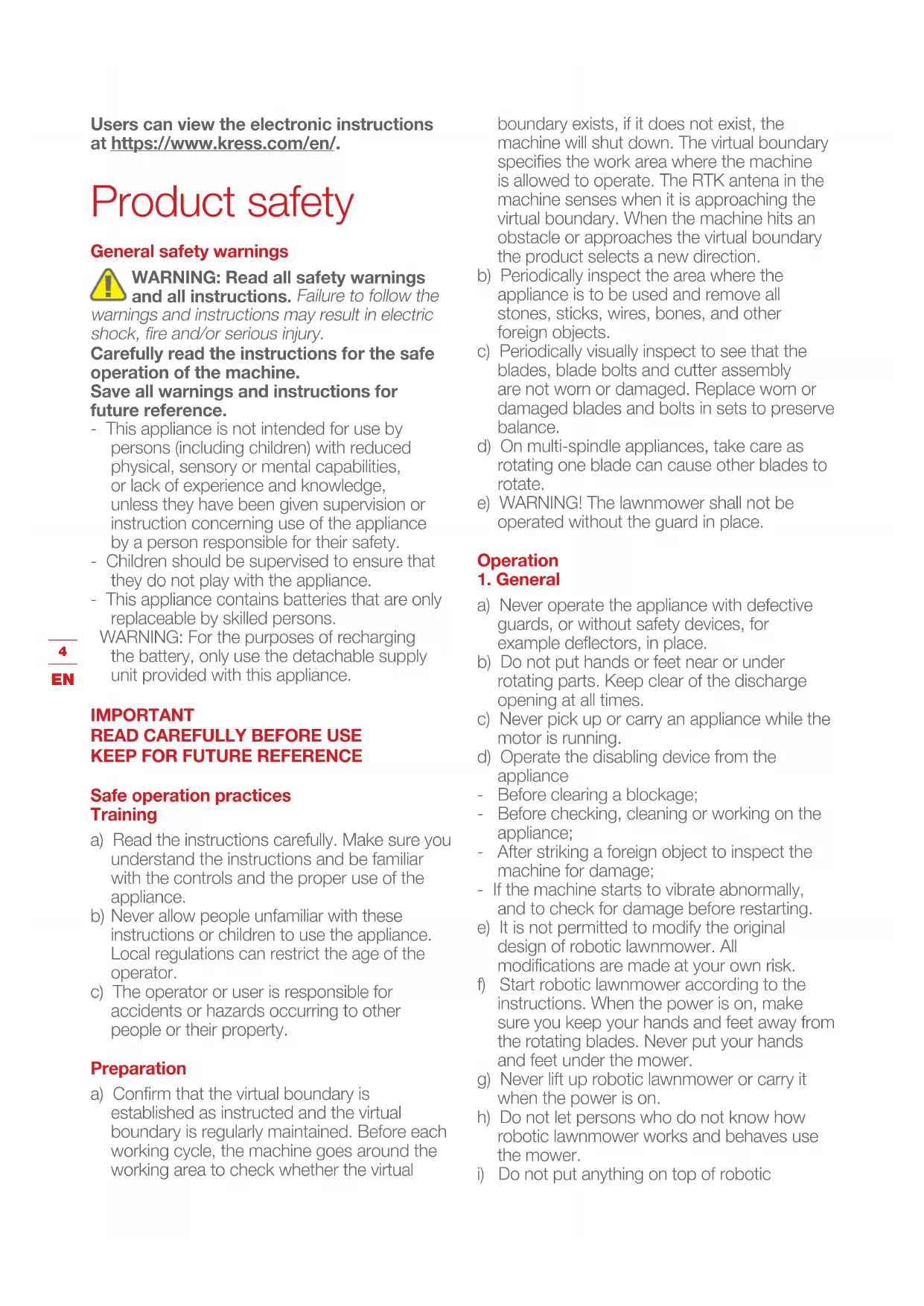 Users can view the electronic instructions at https://www.kress.com/en/. Product safety General safety warnings