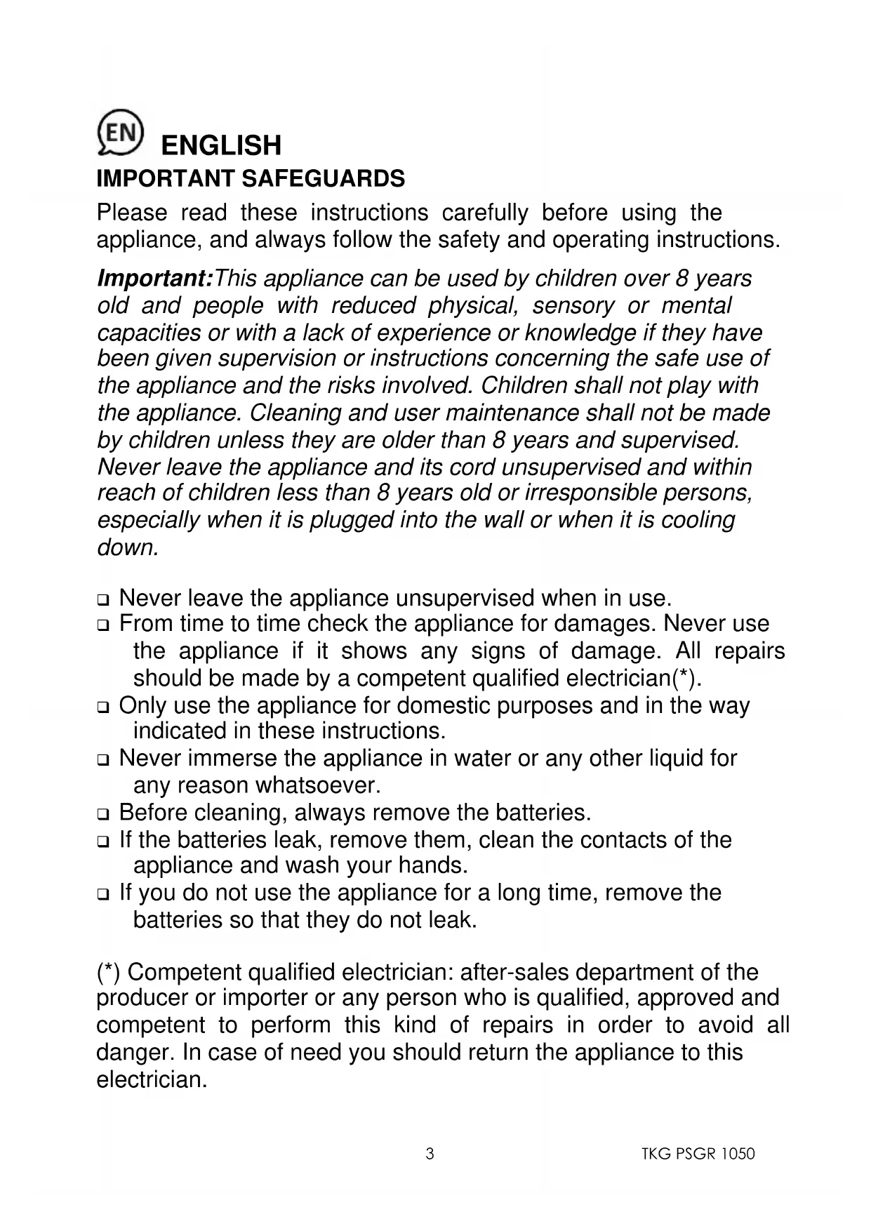 ENGLISH IMPORTANT SAFEGUARDS Please read these instructions carefully before using the appliance, and always follow the safety and operating instructions. Important:This appliance can be used by children over 8 years old and people with reduced physical, sensory or mental capacities or with a lack of experience or knowledge if they have been given supervision or instructions concerning the safe use of the appliance and the risks involved. Children shall not play with the appliance. Cleaning and user maintenance shall not be made by children unless they are older than 8 years and supervised. Never leave the appliance and its cord unsupervised and within reach of children less than 8 years old or irresponsible persons, especially when it is plugged into the wall or when it is cooling down. ❑ Never leave the appliance unsupervised when in use. ❑ From time to time check the appliance for damages. Never use the appliance if it shows any signs of damage. All repairs should be made by a competent qualified electrician(*). ❑ Only use the appliance for domestic purposes and in the way indicated in these instructions. ❑ Never immerse the appliance in water or any other liquid for any reason whatsoever. ❑ Before cleaning, always remove the batteries. ❑ If the batteries leak, remove them, clean the contacts of the appliance and wash your hands. ❑ If you do not use the appliance for a long time, remove the batteries so that they do not leak. (*) Competent qualified electrician: after-sales department of the producer or importer or any person who is qualified, approved and competent to perform this kind of repairs in order to avoid all danger. In case of need you should return the appliance to this electrician.TKG PSGR 1050