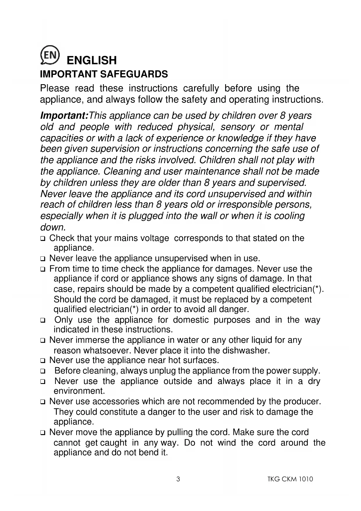 ENGLISH IMPORTANT SAFEGUARDS Please read these instructions carefully before using the appliance, and always follow the safety and operating instructions. Important:This appliance can be used by children over 8 years old and people with reduced physical, sensory or mental capacities or with a lack of experience or knowledge if they have been given supervision or instructions concerning the safe use of the appliance and the risks involved. Children shall not play with the appliance. Cleaning and user maintenance shall not be made by children unless they are older than 8 years and supervised. Never leave the appliance and its cord unsupervised and within reach of children less than 8 years old or irresponsible persons, especially when it is plugged into the wall or when it is cooling down. ❑ Check that your mains voltage corresponds to that stated on the appliance. ❑ Never leave the appliance unsupervised when in use. ❑ From time to time check the appliance for damages. Never use the appliance if cord or appliance shows any signs of damage. In that case, repairs should be made by a competent qualified electrician(*). Should the cord be damaged, it must be replaced by a competent qualified electrician(*) in order to avoid all danger. ❑ Only use the appliance for domestic purposes and in the way indicated in these instructions. ❑ Never immerse the appliance in water or any other liquid for any reason whatsoever. Never place it into the dishwasher. ❑ Never use the appliance near hot surfaces. ❑ Before cleaning, always unplug the appliance from the power supply. ❑ Never use the appliance outside and always place it in a dry environment. ❑ Never use accessories which are not recommended by the producer. They could constitute a danger to the user and risk to damage the appliance. ❑ Never move the appliance by pulling the cord. Make sure the cord cannot get caught in any way. Do not wind the cord around the appliance and do not bend it.TKG CKM 1010
