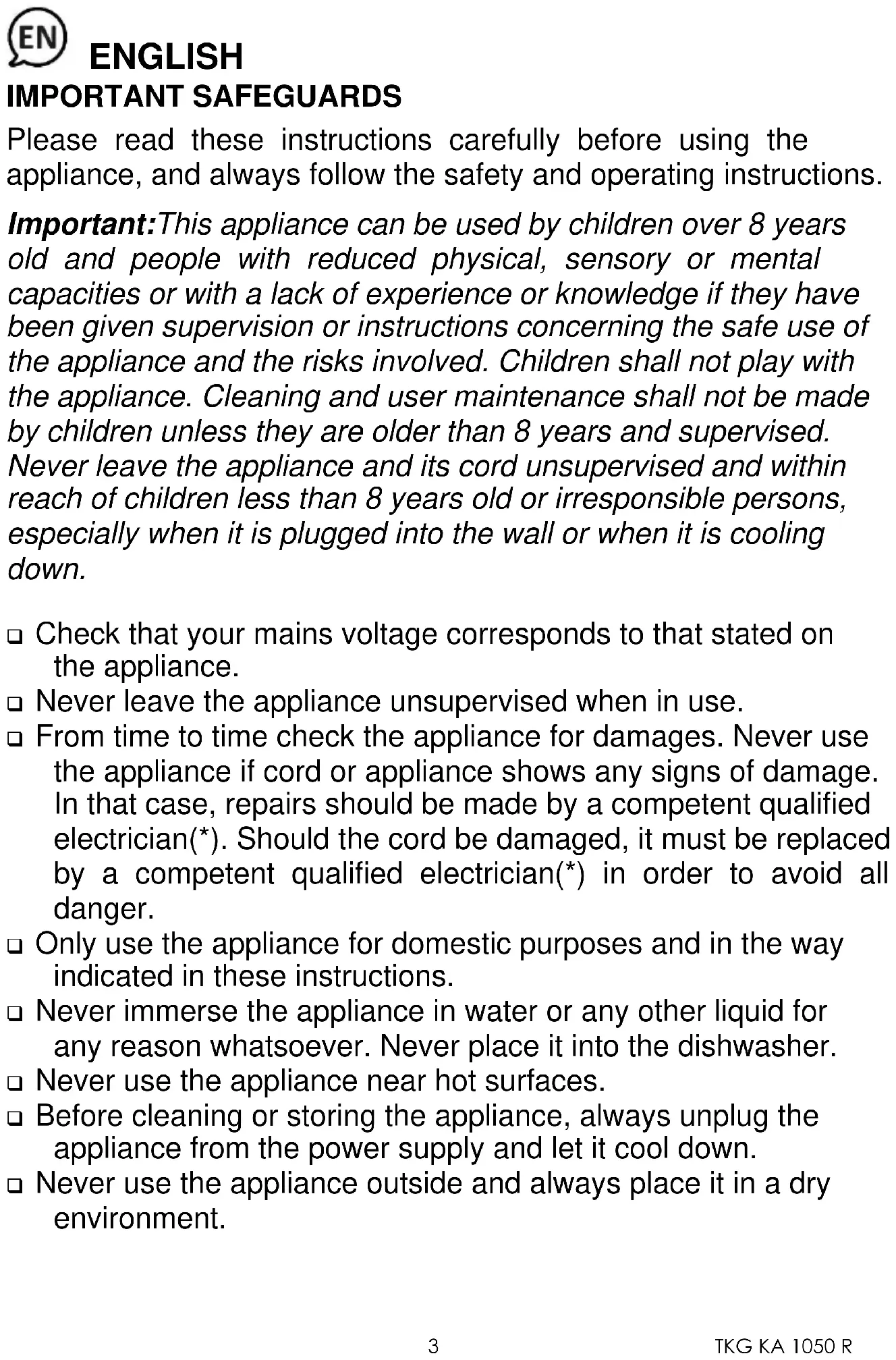 ENGLISH IMPORTANT SAFEGUARDS Please read these instructions carefully before using the appliance, and always follow the safety and operating instructions. Important:This appliance can be used by children over 8 years old and people with reduced physical, sensory or mental capacities or with a lack of experience or knowledge if they have been given supervision or instructions concerning the safe use of the appliance and the risks involved. Children shall not play with the appliance. Cleaning and user maintenance shall not be made by children unless they are older than 8 years and supervised. Never leave the appliance and its cord unsupervised and within reach of children less than 8 years old or irresponsible persons, especially when it is plugged into the wall or when it is cooling down. ❑ Check that your mains voltage corresponds to that stated on the appliance. ❑ Never leave the appliance unsupervised when in use. ❑ From time to time check the appliance for damages. Never use the appliance if cord or appliance shows any signs of damage. In that case, repairs should be made by a competent qualified electrician(*). Should the cord be damaged, it must be replaced by a competent qualified electrician(*) in order to avoid all danger. ❑ Only use the appliance for domestic purposes and in the way indicated in these instructions. ❑ Never immerse the appliance in water or any other liquid for any reason whatsoever. Never place it into the dishwasher. ❑ Never use the appliance near hot surfaces. ❑ Before cleaning or storing the appliance, always unplug the appliance from the power supply and let it cool down. ❑ Never use the appliance outside and always place it in a dry environment.TKG KA 1050 R