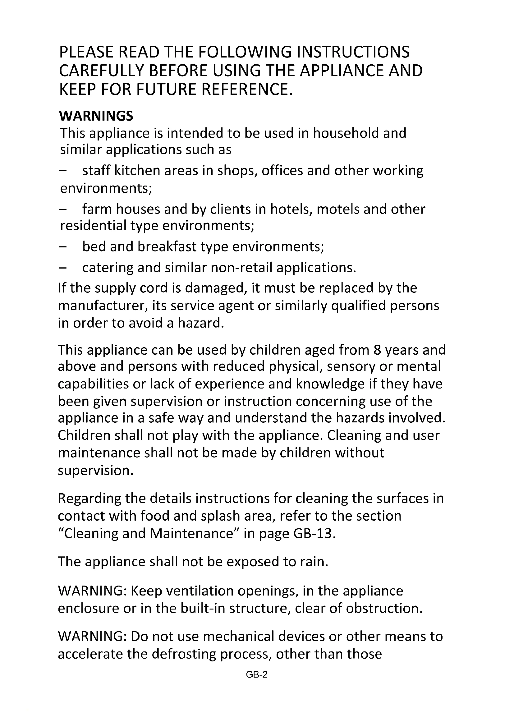 or l) Recommended temperature setting for optimised food storage (°C) Freezing capacity (kg/24 h) Defrosting type (auto-defrost = A, manual defrost = M) Pantry no — — — — Wine storage no — — — — Cellar no — — — — Fresh food yes 41,0 4 — M Chill no — — — —Climate class: – Temperate: ‘this refrigerating appliance is intended to be used at ambient temperatures ranging from 16 °C to 32 °C’. – Subtropical: ‘this refrigerating appliance is intended to be used at ambient temperatures ranging from 16 °C to 38 °C’. GB-16 This refrigerating appliance is not in tended to be used as a built-in appliance. This refrigerating appliance is not suitable for freezing foodstuffs. To find the model information in the product database : Click the link https://eprel.ec.europa.eu/screen/product/refrigeratingappliances2019/303701 0-star or ice-making no — — — — 1-star no — — — — 2-star no — — — — 3-star no — — — — 4-star no — — — — 2-star section no — — — — Variable temperature compartment
