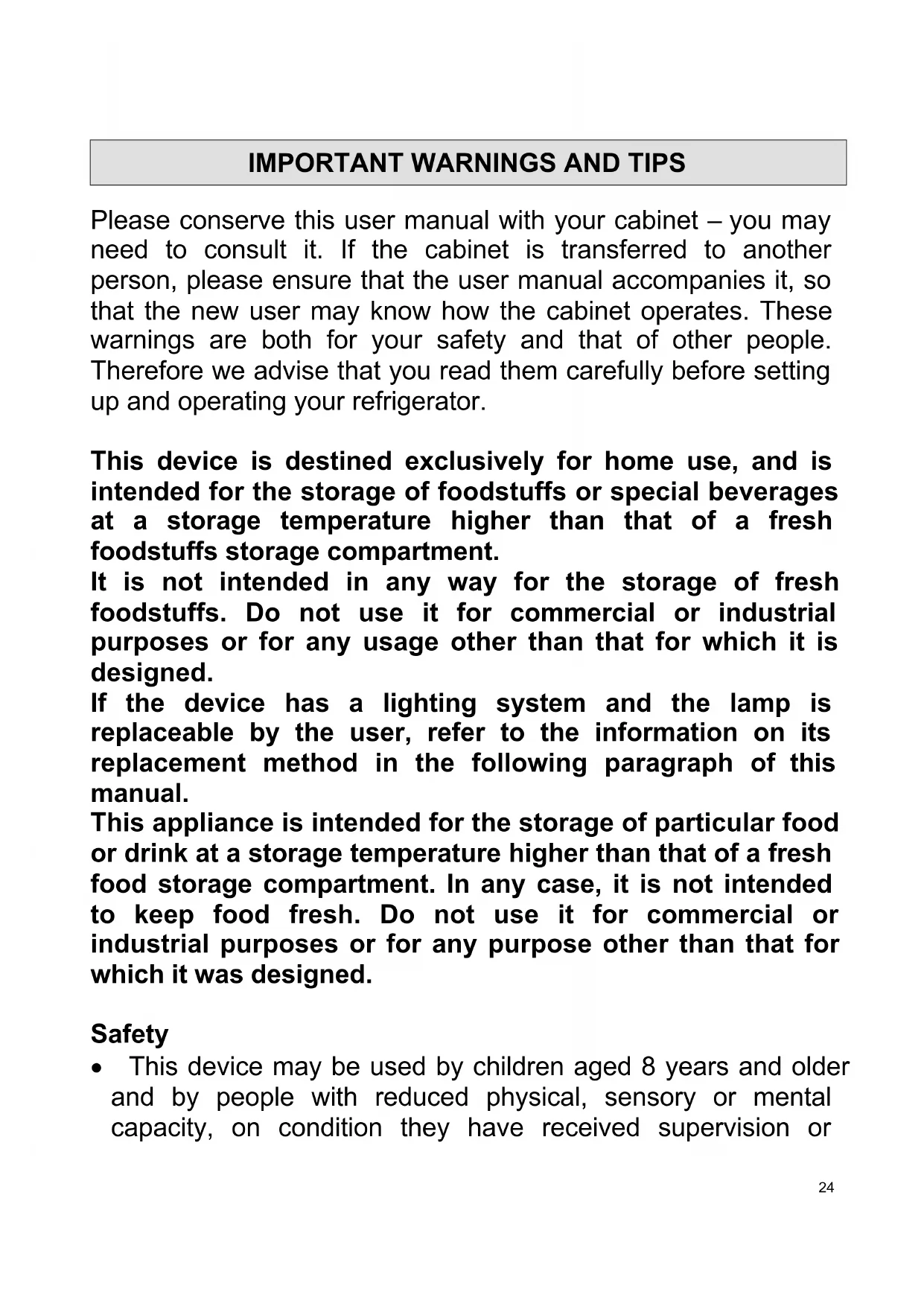 Please conserve this user manual with your cabinet – you may need to consult it. If the cabinet is transferred to another person, please ensure that the user manual accompanies it, so that the new user may know how the cabinet operates. These warnings are both for your safety and that of other people. Therefore we advise that you read them carefully before setting up and operating your refrigerator. This device is destined exclusively for home use, and is intended for the storage of foodstuffs or special beverages at a storage temperature higher than that of a fresh foodstuffs storage compartment. It is not intended in any way for the storage of fresh foodstuffs. Do not use it for commercial or industrial purposes or for any usage other than that for which it is designed. If the device has a lighting system and the lamp is replaceable by the user, refer to the information on its replacement method in the following paragraph of this manual. This appliance is intended for the storage of particular food or drink at a storage temperature higher than that of a fresh food storage compartment. In any case, it is not intended to keep food fresh. Do not use it for commercial or industrial purposes or for any purpose other than that for which it was designed. Safety