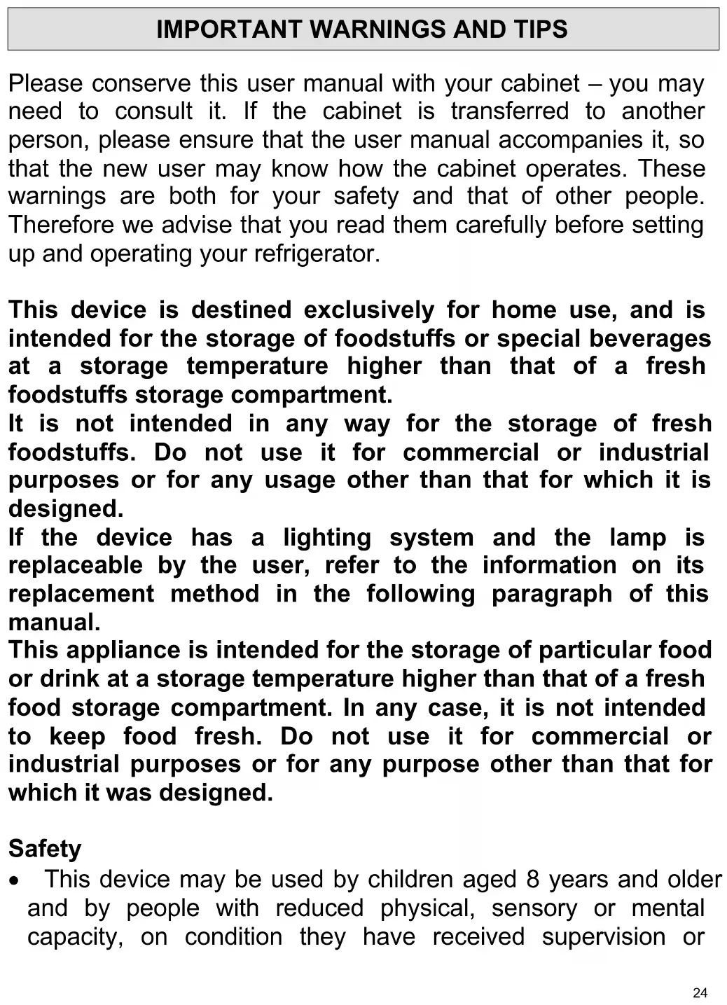 Please conserve this user manual with your cabinet – you may need to consult it. If the cabinet is transferred to another person, please ensure that the user manual accompanies it, so that the new user may know how the cabinet operates. These warnings are both for your safety and that of other people. Therefore we advise that you read them carefully before setting up and operating your refrigerator. This device is destined exclusively for home use, and is intended for the storage of foodstuffs or special beverages at a storage temperature higher than that of a fresh foodstuffs storage compartment. It is not intended in any way for the storage of fresh foodstuffs. Do not use it for commercial or industrial purposes or for any usage other than that for which it is designed. If the device has a lighting system and the lamp is replaceable by the user, refer to the information on its replacement method in the following paragraph of this manual. This appliance is intended for the storage of particular food or drink at a storage temperature higher than that of a fresh food storage compartment. In any case, it is not intended to keep food fresh. Do not use it for commercial or industrial purposes or for any purpose other than that for which it was designed. Safety