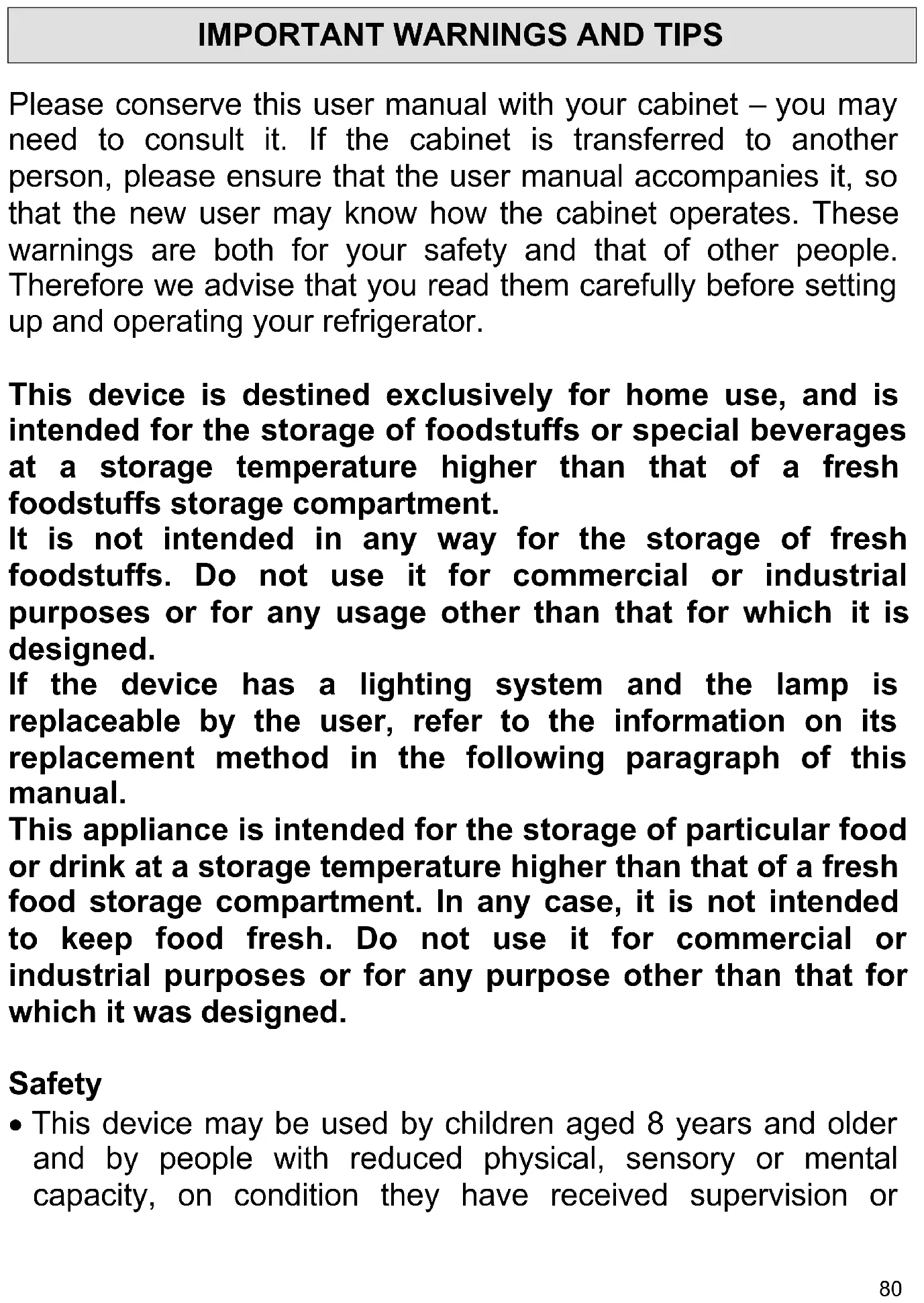 Please conserve this user manual with your cabinet – you may need to consult it. If the cabinet is transferred to another person, please ensure that the user manual accompanies it, so that the new user may know how the cabinet operates. These warnings are both for your safety and that of other people. Therefore we advise that you read them carefully before setting up and operating your refrigerator. This device is destined exclusively for home use, and is intended for the storage of foodstuffs or special beverages at a storage temperature higher than that of a fresh foodstuffs storage compartment. It is not intended in any way for the storage of fresh foodstuffs. Do not use it for commercial or industrial purposes or for any usage other than that for which it is designed. If the device has a lighting system and the lamp is replaceable by the user, refer to the information on its replacement method in the following paragraph of this manual. This appliance is intended for the storage of particular food or drink at a storage temperature higher than that of a fresh food storage compartment. In any case, it is not intended to keep food fresh. Do not use it for commercial or industrial purposes or for any purpose other than that for which it was designed. Safety