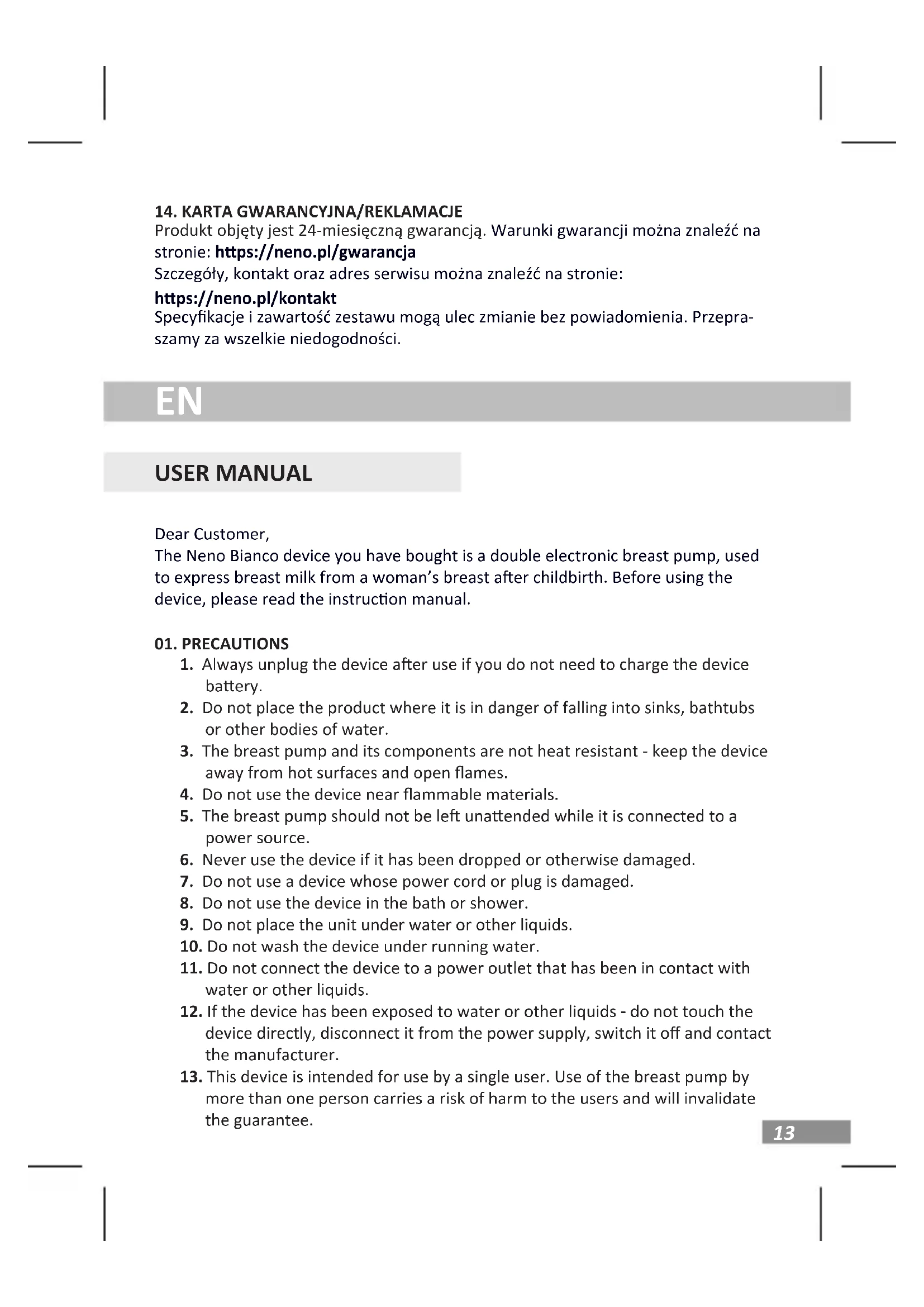 USER MANUAL Dear Customer, The Neno Bianco device you have bought is a double electronic breast pump, used to express breast milk from a woman’s breast aer childbirth. Before using the device, please read the instrucon manual.